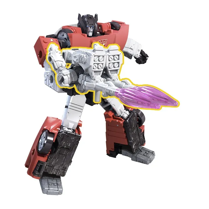 This articulated 5.5-inch scale Deluxe Class WFC-S10 SIDESWIPE action figure features classic conversion between robot and CYBERTRONIAN car modes in 16 steps. The WFC-S10 SIDESWIPE figure features story-inspired battle-worn deco and is equipped with a W-10 Photo-Pulser Proton Launcher weapon accessory and a W-5 Gyro Blaster weapon accessory. The 2 weapon accessories mod-lock together to form the larger RR Gyrofuse Axleswitch Hyper-Blaster.