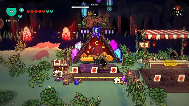 Tarot Cards will be crucial in every single dungeon run, and that’s because they’re potent bonuses that can change the tide of your run. You’ll sometimes find Tarot Cards in chests, and in each phase of a dungeon, you’ll almost always come across an NPC that lets you choose one of three to activate for free. Mind you, these bonuses only last for this dungeon run, so don’t grow too attached, but in the late-game parts of Cult of the Lamb, you’ll complete a dungeon with nearly 10 cards activated. Some give you extra health, others speed up attacks or boost their damage, and some can even resurrect you.