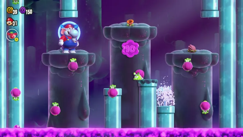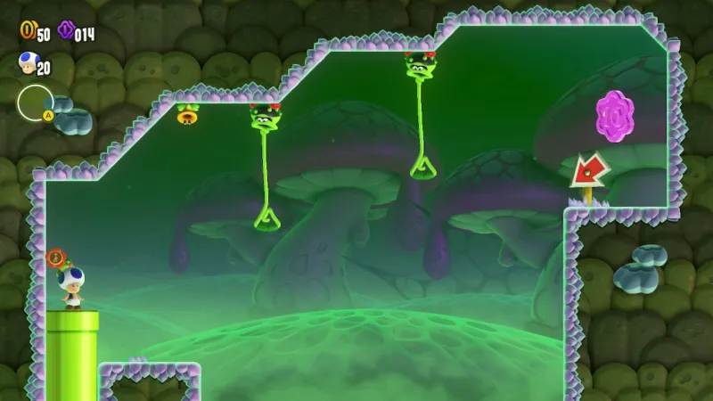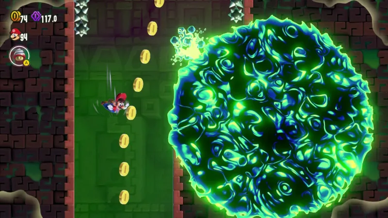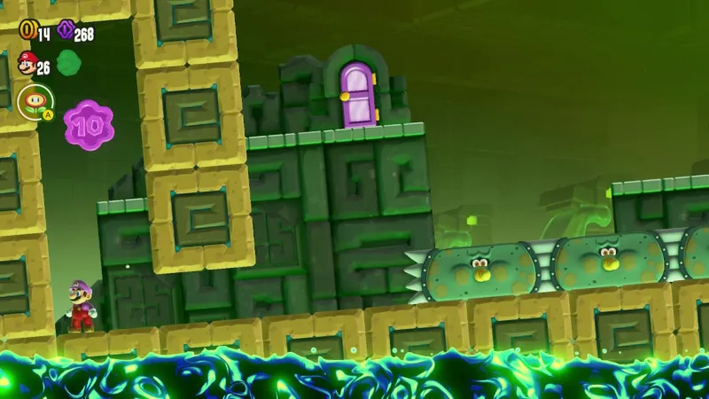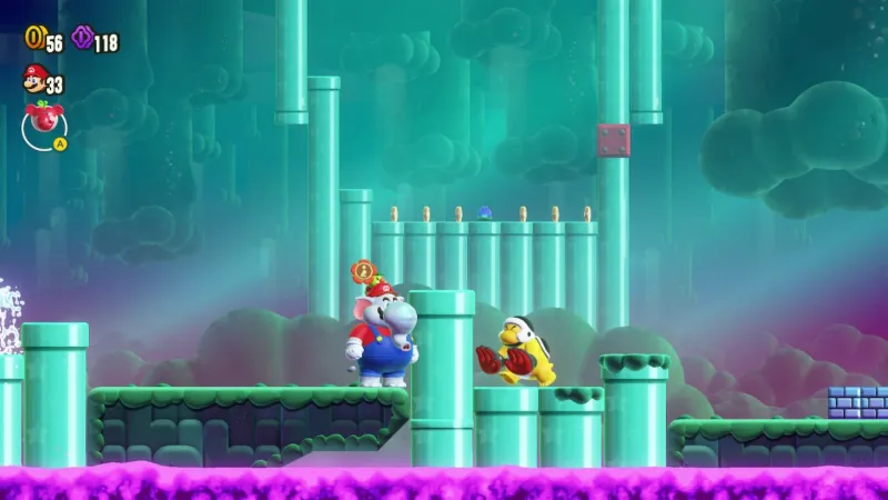 - During the Wonder Effect, you’ll see coin 3 floating above the acid. The pipe above it will fall, and you need to quickly jump on it before it sinks into the acid below.