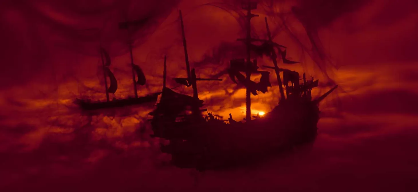 Chapman: You can see skeleton ships in the background and the brigantine. If you go back and freeze frame it, you will see the two ships firing at each other. Rowboats are in there, too.