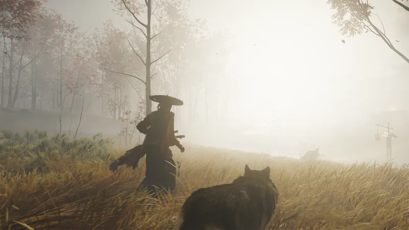 Nate Fox: The wolf shadows you throughout your adventure. It's a wild animal. It's definitely not a dog that comes when called. It is an ally that is a representation of the wilderness. Now, Atsu is kind of attuned to the natural world and so there are a great variety of different animals in Ezo that she can kind of get close to and interact with, like a big herd of wild horses you can ride inside of and kind of speed up as you're amongst them all. It's a great thing for the player to discover as they're out exploring Ezo itself. But as far as allies go, the wolf is your prime animal ally.