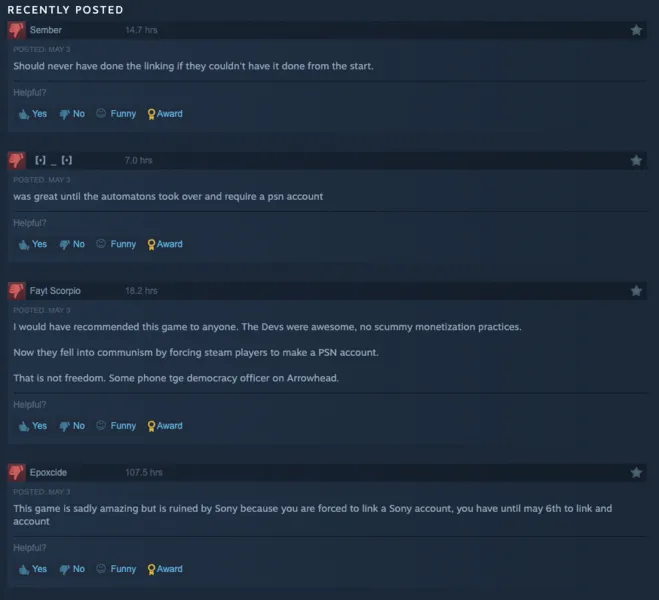 PlayStation will not be requiring Helldivers 2 players to link their Steam accounts to PlayStation Network accounts following widespread backlash from the game's community. This follows days of turmoil amongst players, leading to Helldivers 2 on Steam dropping from a "Mostly Positive"-rated game to "Mixed" for all reviews and "Mostly Negative" for recent reviews. Even the first Helldivers started receiving bad reviews as a result of this, according to developer Arrowhead Game Studios' CEO Johaan Pilestedt.