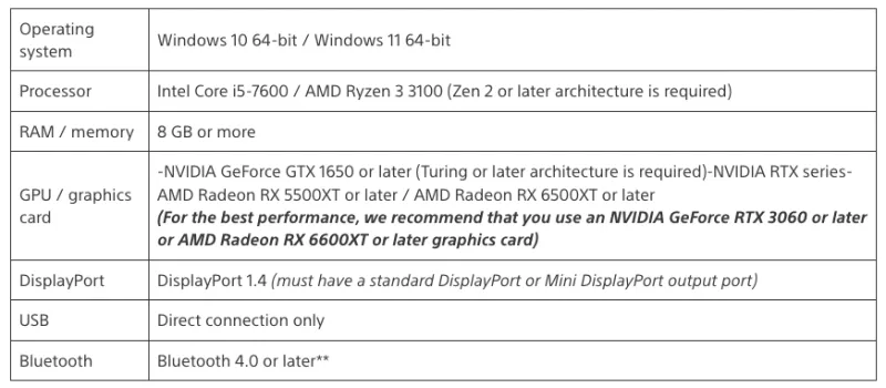 Here's a look at the minimum PC requirements to use PlayStation VR2 on your PC: