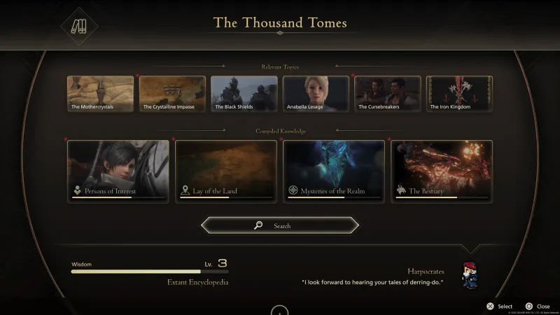 To go even more in-depth and learn about story elements you might have missed during a cutscene, you can visit Harpocrates and his Thousand Tomes in Cid's Hideaway, a hub found early in the game. As you visit him throughout your adventure, you can tell Harpocrates about the things you've seen and the people you've encountered, and he'll update his archives accordingly. Not only does the Thousand Tomes allow you to review any Active Time Lore entry, but it also provides quick suggestions for other entries you might want to brush up on. For example, the entry for "Eikon" might link you to "Dominant," "Magic," and "Crystal."