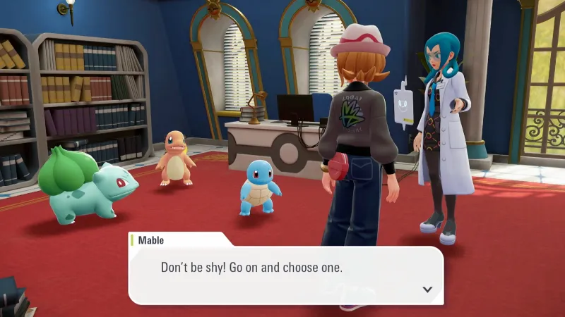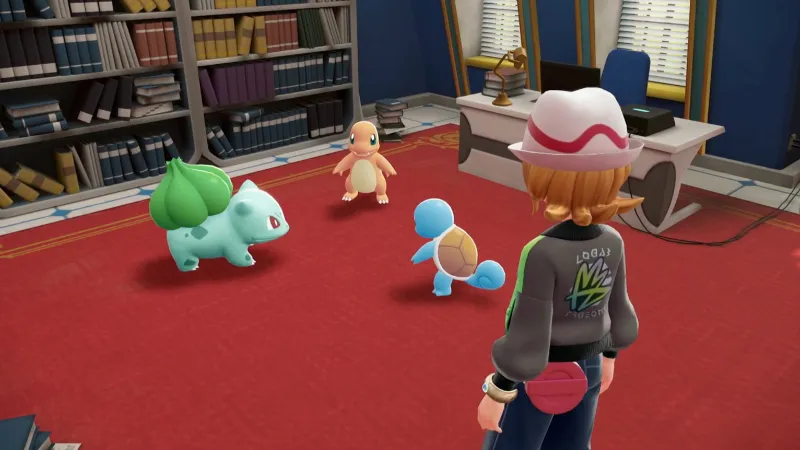 To complete it, head to the Pokémon Research Lab and take the elevator up to Mable’s office. Once here, you’ll see three familiar Pokémon: Bulbasaur, Charmander, and Squirtle.