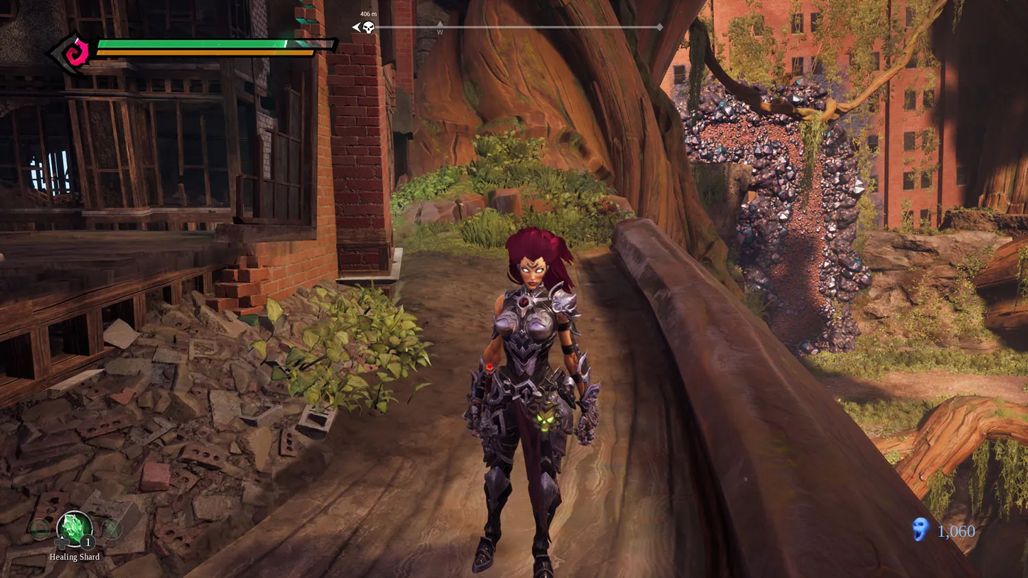 From there, Fury begins the task given to her by the council: collecting the seven deadly sins. Fury is dropped into a what appears to be a city street that has lost a long war with nature. Dilapidated cars litter the overgrown street, and it immediately recalls locations explored by War in the original Darksiders. Also like the original game, Fury is joined by a Watcher, a companion character that reminds her of her mission and occasionally offers assistance. In the first game, the Charred Council sent a Watcher (voiced by Mark Hamill in that game) with War to keep an eye on him and make sure he stuck to his mission. It’s safe to assume Fury’s Watcher is with her for the same reasons.