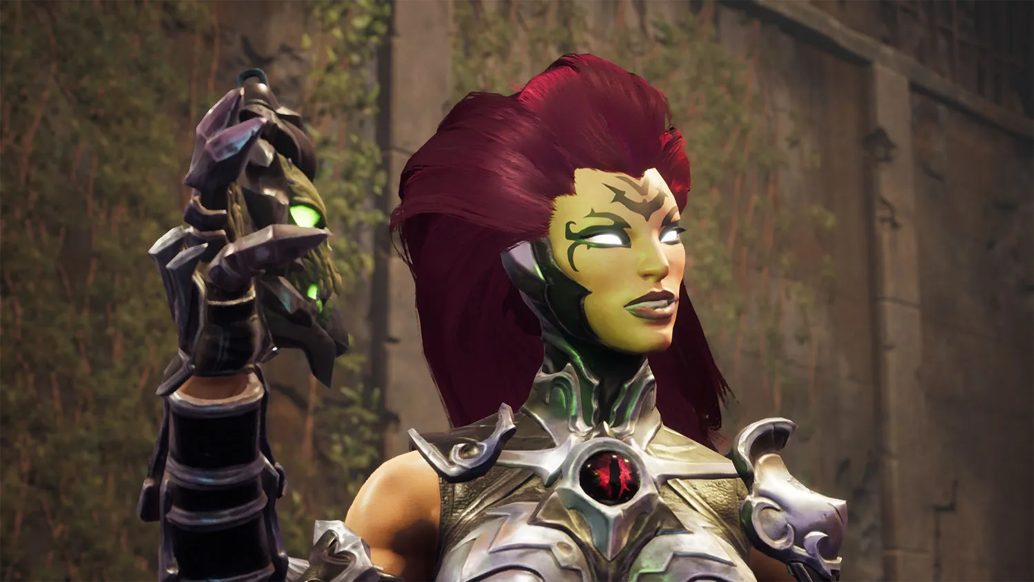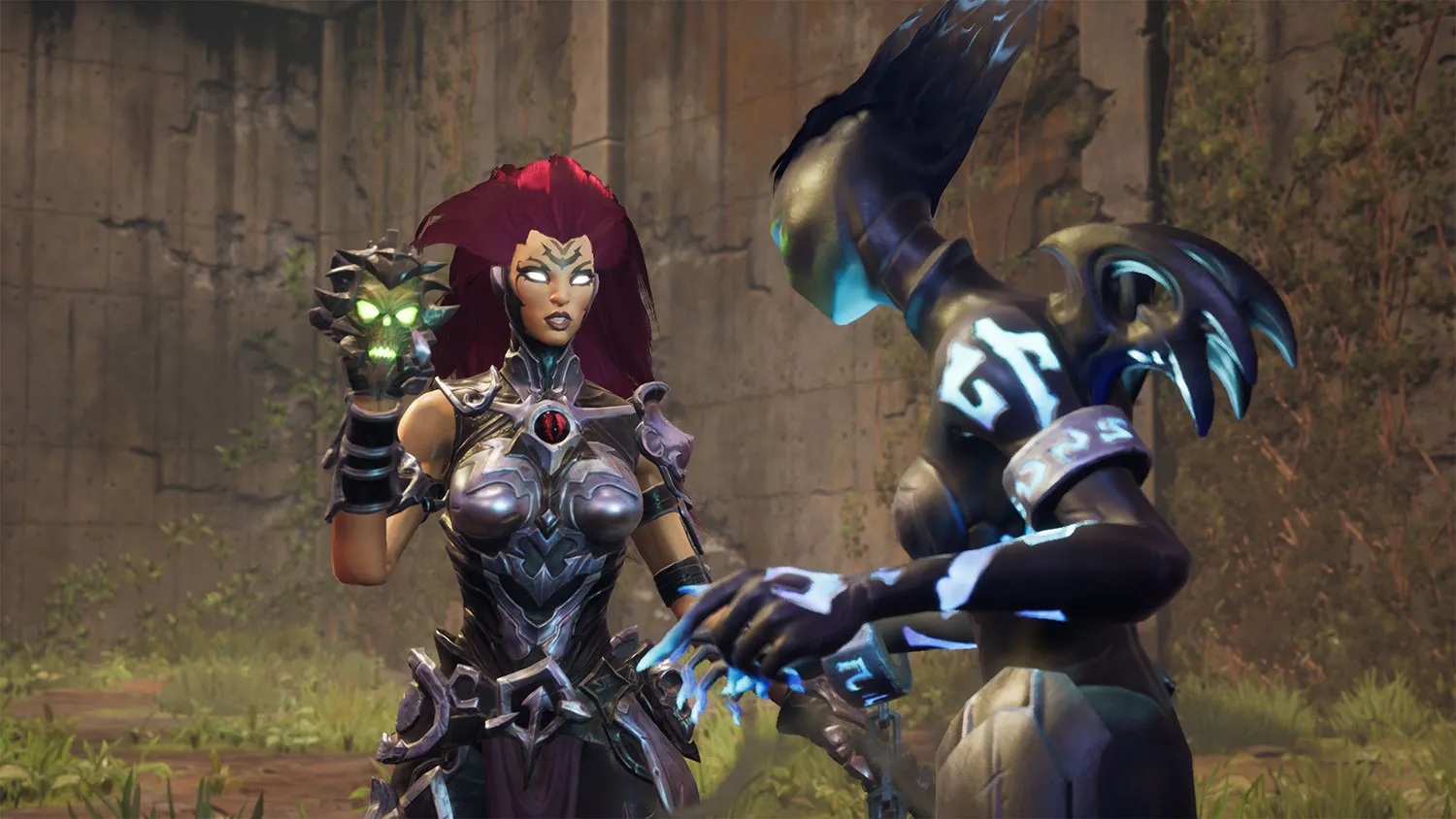 Knowing her patterns now, I defeat Envy and trigger a cutscene. The Watcher accuses Fury of killing Envy instead of capturing her, but Fury holds up a glowing green talisman she stole from around Envy’s neck that sucks up her essence. It glows and functions like the Nephilim amulet that Death used to store the souls of his departed brethren in Darksiders II, but they appear to be two different objects, despite the similarities.