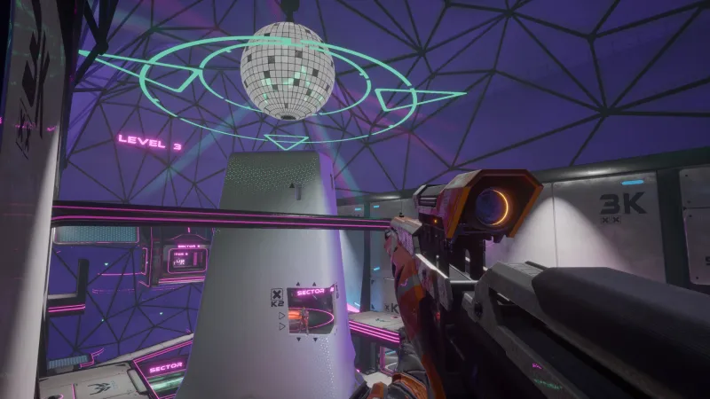 Headshots, of course, are the fastest way to vanquish opponents, and each map offers a plethora of vantage points to make those bullets or plasma rounds easier to land. “Olympus,” a sporty arena touting neon-blue advertisements and floating platforms, provides many opportunities for sneaky portal routes. If players are truly clever, they can create optimal sight-lines on both ends of the map. “Silo,” with its iridescent lights and chillwave music, is club-themed. Its middle sector is a popular battleground, but long corridors make the trip to the center susceptible to ambushes. On “Helix,” close-combat weapons like shotguns and, surprisingly, rocket launchers, reign supreme. Here, tight hallways prevent quick portal escapes, so gun accuracy is key. Finally, the galactic “Outpost” houses an overarching sniper tower, only accessible by portals, well-timed jumps, and player-momentum.