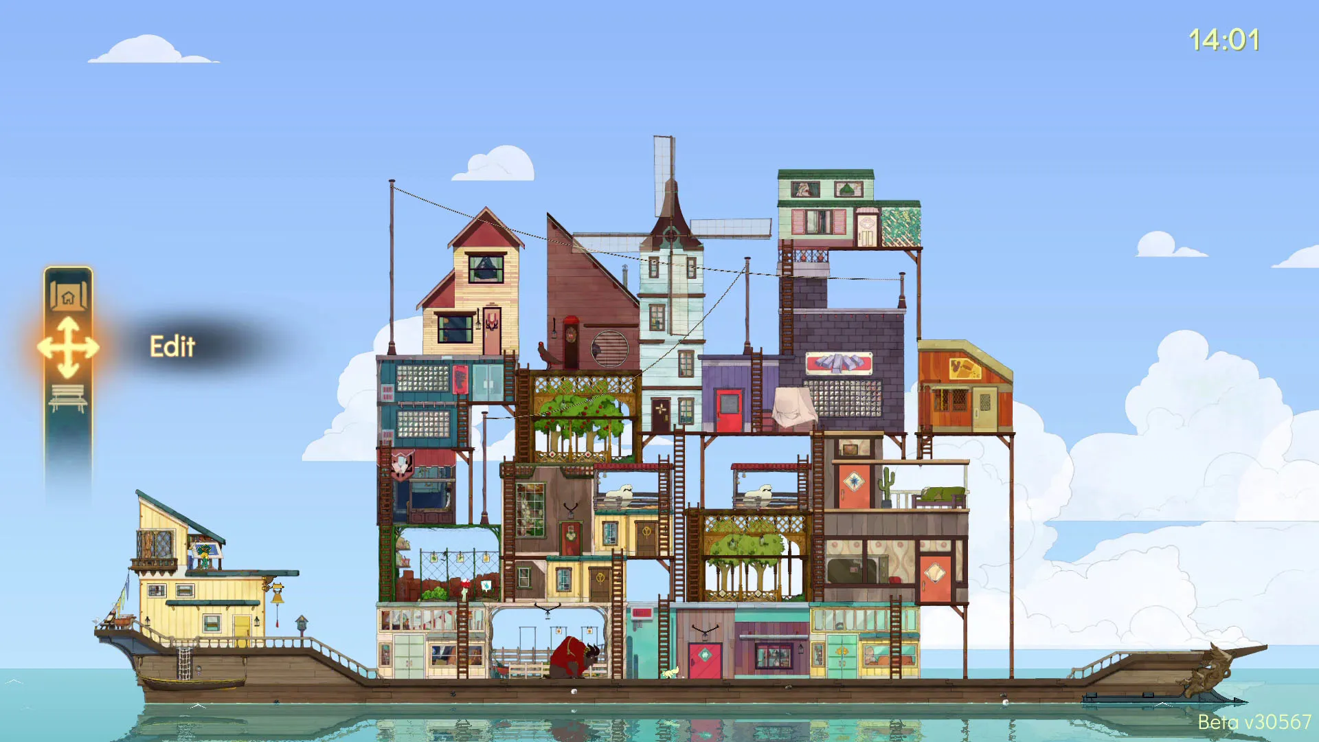 I explore the boat, admiring its sprawling town-like quality; multiple levels of structures are built on top of each other, and they all have specific purposes. Some are for growing vegetables, some are for crafting, and some are homes for the various spirits who have favors to ask. You place these buildings yourself with a surprising degree of freedom, so the layout of everyone’s floating settlement will be different.