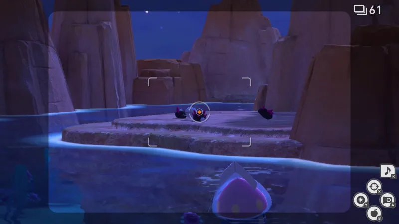 After chatting with Professor Mirror and further filling out the Photodex, we jump back into Blushing Beach. However, this time, we’re going at night. As you might expect, the Pokémon you spot after the sun sets are often different from the ones you see running, flying, and swimming during the day. Even as the character is phasing into the environment, I spot a Drifblim in the background. Right off the bat, a towering Zangoose walks along the path. We throw the Zangoose a fluffruit and get a great shot of him smiling as he enjoys it.