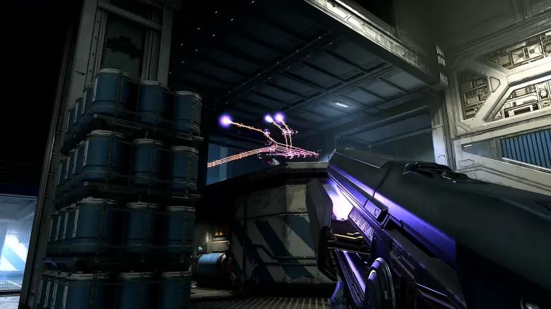 Running over the course of last weekend, this first flight of the Infinite tech preview was limited to 4v4 Slayer matches against bots, which received savage AI upgrades each day of the test. Given the smaller skirmishes, the maps available were of a similar scale, though I never felt trapped or found myself spawned directly into a firefight. Each area has plenty of ways to get around. Due to the density of hallways, corridors, and more open battlefields, I never lacked the choice to attack someone's flank or run directly into the conflict.