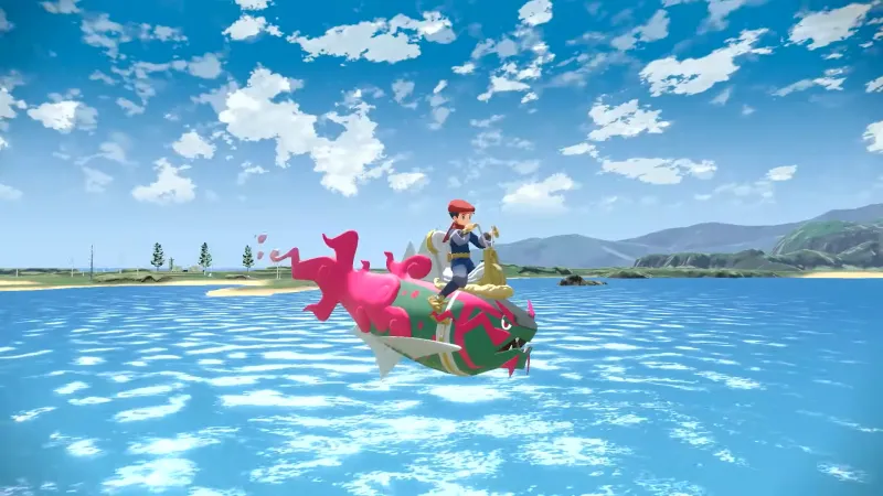 We caught a glimpse of this bay in the previous trailer, but the family of Buizel and Floatzel is new. There's also a disconnected archway, a distant bluff, and islands sitting in the background waiting to be explored. The clouds peppering the sky give texture to the scene as the sky fades into a potential storm on the horizon.
