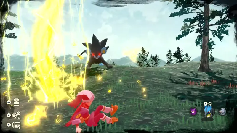 Throughout the trailer, we can see the user interface displayed in the bottom corners of the screen. On the left, there are three icons: one that looks like a cell phone – odd for a game set in the distant past – which can be accessed by pressing the minus button, an item menu set to up on the d-pad, and down will get you to a journal (possibly your Pokédex).