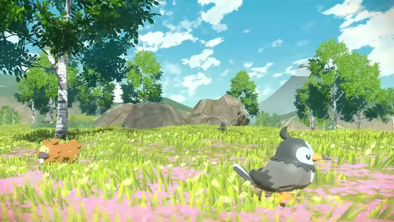 The trailer begins with a shot of Bidoof and Starly wandering on a hill, and while this screenshot doesn't convey it, these Pokemon are moving at a much higher framerate than in the announcement trailer. It's a huge improvement technical improvement right out of the gate!