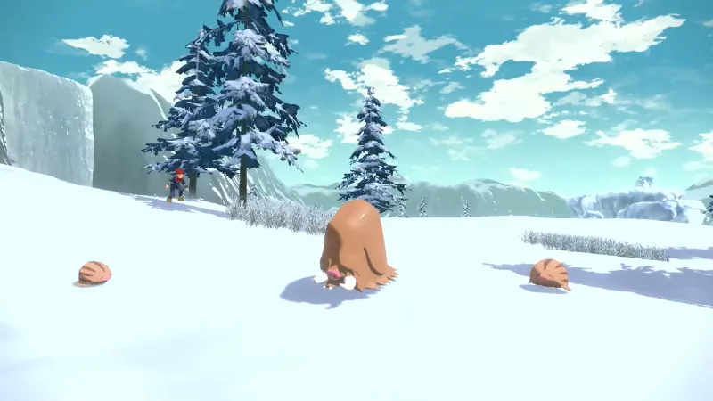 Our first glimpse of a snow-covered portion of Hisui begins with a trainer creeping behind some Swinub and Piloswine, two stalwart ice Pokémon in their natural habitat. Due to its original positioning on the Diamond and Pearl map, this winter wonderland is possibly at the North end of the island, though we don't know how Sinnoh's climate has changed over the years.