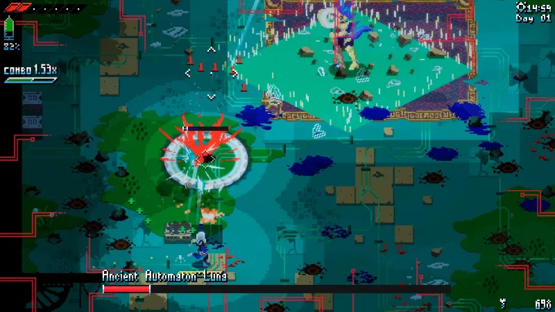 Complimenting the combat is Alma’s smooth, snappy movement. The way she runs, jumps, and climbs up structures feels great, and it doesn’t take long before you’re gleefully maneuvering around areas while slashing enemies to scrap. Unsighted knows how good it plays by challenging players with a fair amount of platforming challenges that, again, is unexpected in a game with this perspective, but it works. It also makes exploring Unsighted’s giant world a treat. The game is basically a top-down Metroidvania, and your main goal is to collect five scattered meteor shards, each guarded by a big bad. You can pursue shards in any order with certain obstacles blocked until you either purchase or locate a weapon to clear it. Along the way, you’ll find side objectives, lore bits, and other secrets worth going out of your way to uncover – provided you think it’s worth the time.