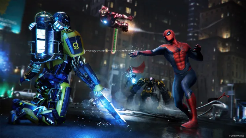Of course, Spider-Man's web-shooters are an important offensive tool. Shooting targets builds up "web status," a meter that, when full, immobilizes enemies. You can also knock webbed-up foes into walls, making them stick there. Webs can also inflict various debuffs unlocked from a skill tree, such as making webbed targets more vulnerable to damage and status effects from other heroes or causing them to drop more health packs upon defeat. Crystal Dynamics says Spider-Man feels like a support hero in that sense.