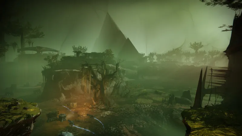 The demo we watched took place during the second mission of the expansion, which gave a great look at the opulent cathedral where Savathûn’s seizure of the Light has manifested an ivory structure into the Throne World. Its too-white surfaces matched with blood-red accents in the surrounding flowerbed/decor give the area a uniquely pristine and regal look from a distance. However, a closer inspection reveals the gross, skin-like texture Hive architecture is known for. The cathedral is only one of the areas we’ll explore on the Throne World, though. Other sections of the new location are less … put together. Traveling to the outskirts of the cathedral area, the terrain shifts into a mucky, dank swamp. This bog is what all of the Throne World looked like before Savathûn took over the Light.