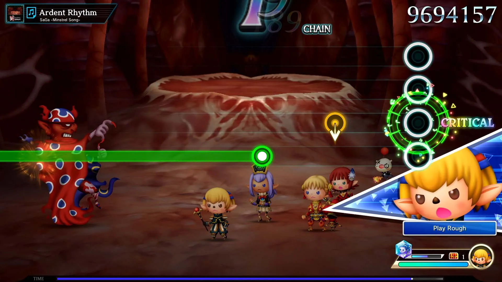 The presentation of field tracks and battle music stages are similar to the first game – your four selected characters, of which there are dozens to choose from spanning most of the included games, either waltz through a simple chibi-esque landscape or fight a chibi enemy from the selected game. It’s simple, and while I initially wanted more out of these scenes, I was soon reminded that my focus would be on the horizontal scroll 99 percent of the song and that I’d be watching the battles happen in my peripherals; which is to say the scenes that play out didn’t affect my enjoyment much in either direction. I’m excited to play through the special music video tracks in the final game, which screen iconic cinematics from Final Fantasy titles, as I think those will feature the visual flare I was missing from the standard tracks.