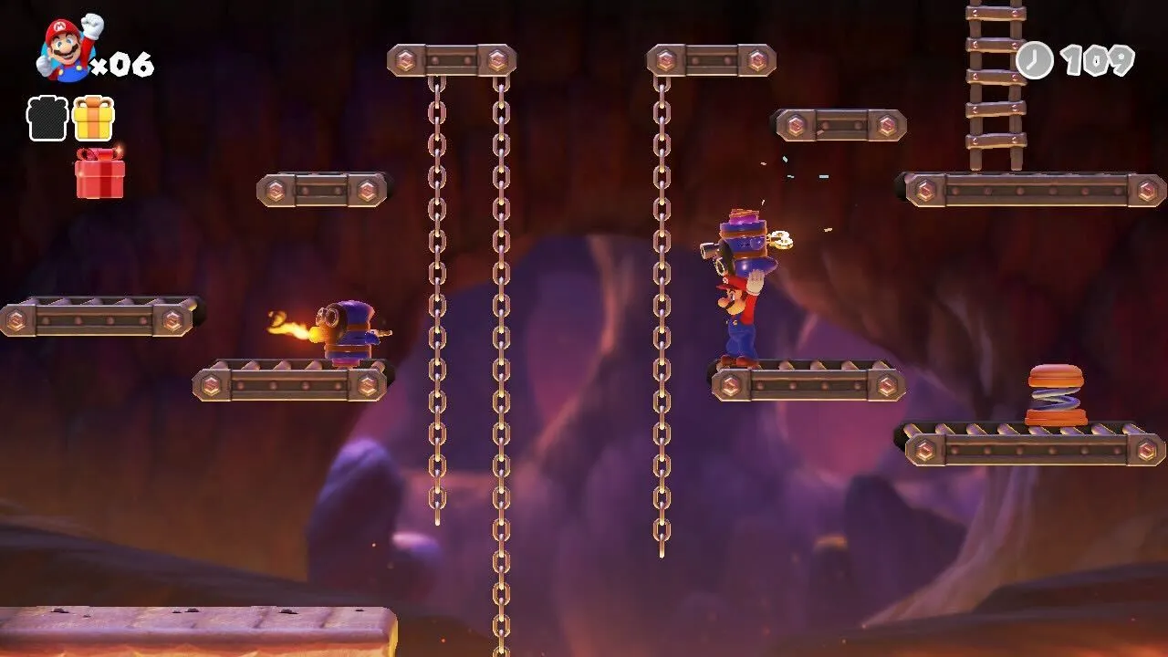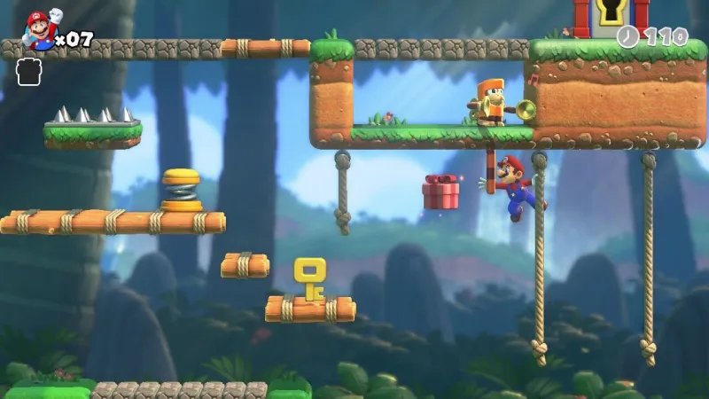 After the local toy store runs out of Mario toys, Donkey Kong goes on a rampage at the toy factory, leaving with a sack full of toys and Mario in hot pursuit. As Mario, you'll go through a series of levels with two parts. In the first section, you need to retrieve a key that unlocks the door Donkey Kong has snuck through. Then, you have to recover the toy he's left behind. It's a simple formula that the game relentlessly iterates on, creating fresh scenarios in every level to keep gameplay engaging.