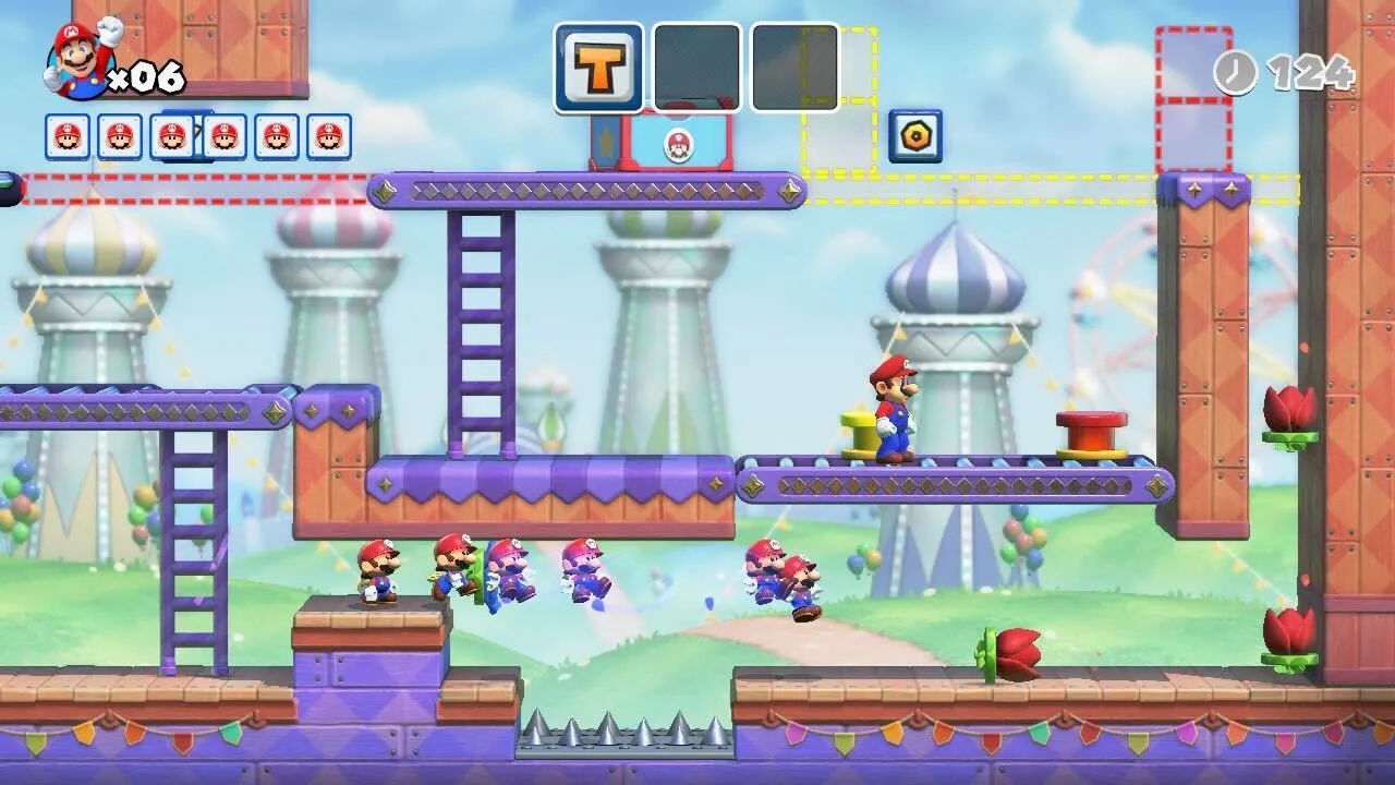 The Switch version of the game includes modern graphics and music (shout-out to the saxophones in World 1), but Nintendo has added new content as well. There are two new worlds, Slippery Summit and Merry Mini-Land, bringing the total from six to eight. It also includes a casual mode, which eliminates the timer and adds checkpoints to the level, so when Mario dies, he just bubbles back to the flag instead of resetting the whole level. The beauty of this mode is that it doesn't diminish the challenge of the puzzle, just the challenge of the platforming, which could certainly trip some people up. This is especially true with later, longer levels, where I could see the value of casual mode if someone doesn't want to re-do the same section over and over after dying. The game also includes a co-op mode, adding a playable Toad for anyone who needs extra help or wants to share the experience with a friend.