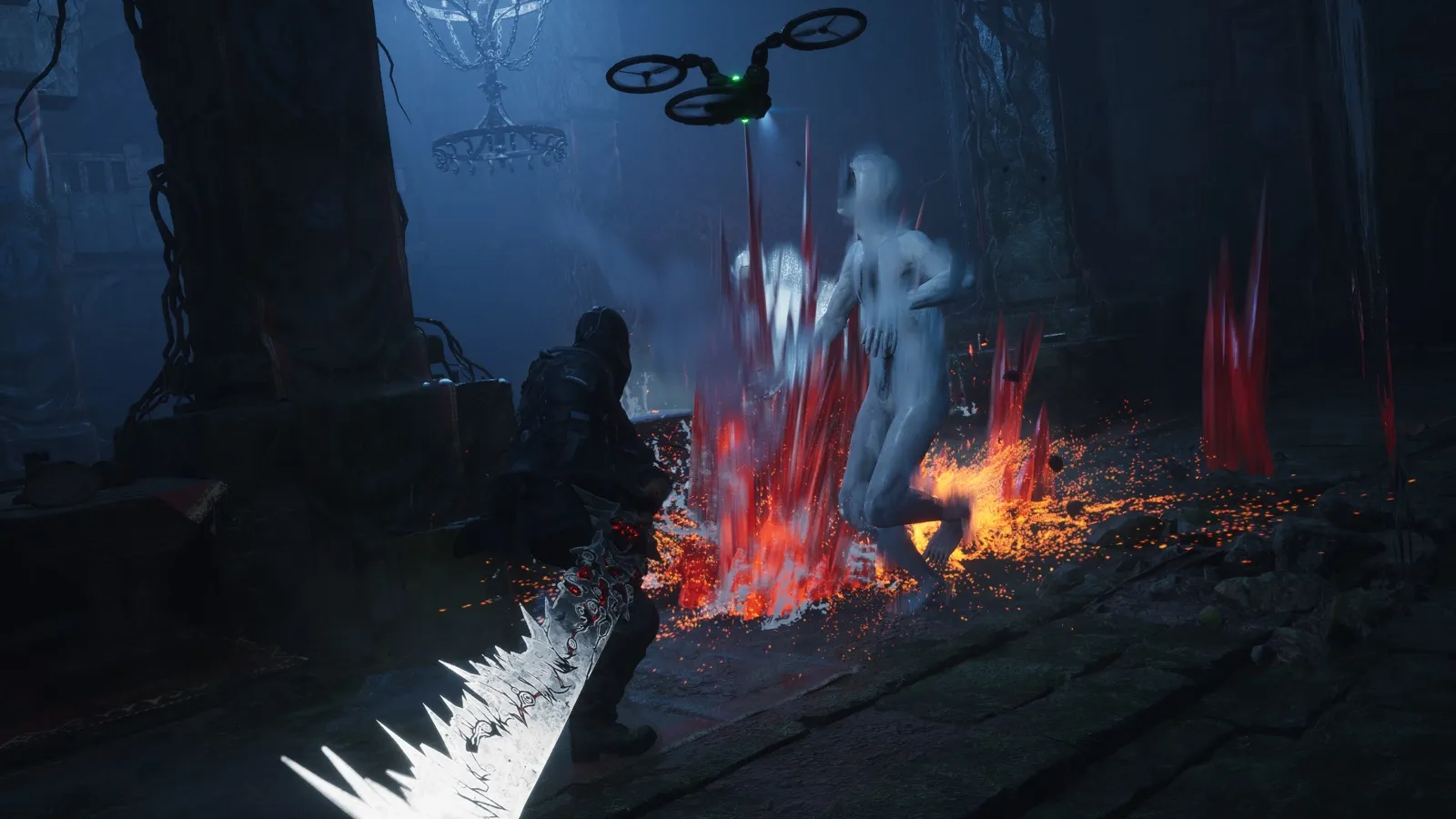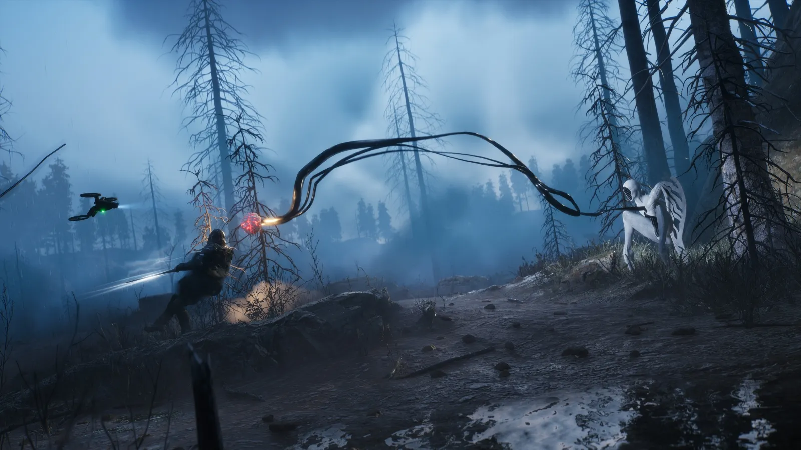 The primary enemies are otherworldly humanoid beings sporting milky white skin and gaping holes where a face or abdomen would be. They look like living abstract art sculptures. They come in various types, including one with giant wavy flaps on its back like it's wearing a fleshy wingsuit. Some also have the nasty habit of expelling bizarre kaleidoscopic entities of energy that double as standalone threats. These take many abstract shapes and sizes, often resembling living blown glass sculptures that vibrate as they emit spine-tingling shrieks and howls. They’re a stark contrast to their comparatively mundane-looking hosts.