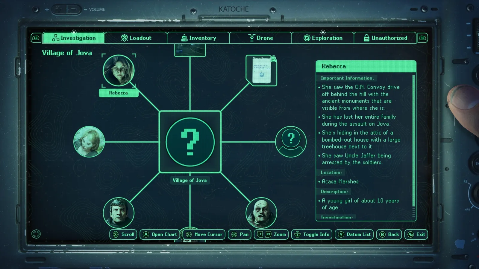 During conversations, you can ask characters questions about a specific investigation and more general inquiries, such as their insights on Hadea as a whole or the civil war. These answers may yield new information on these subjects, so it's worth getting their perspectives. Each investigation has a flow chart in the menu, which tracks various mysteries tied to it. Clues, whether a person, item, or event, have a section on the chart updated with new info as you learn more about them. A person, for example, has categories that gradually fill out, such as their location, a general description of them, a list of key facts, and the investigation they’re tied to.