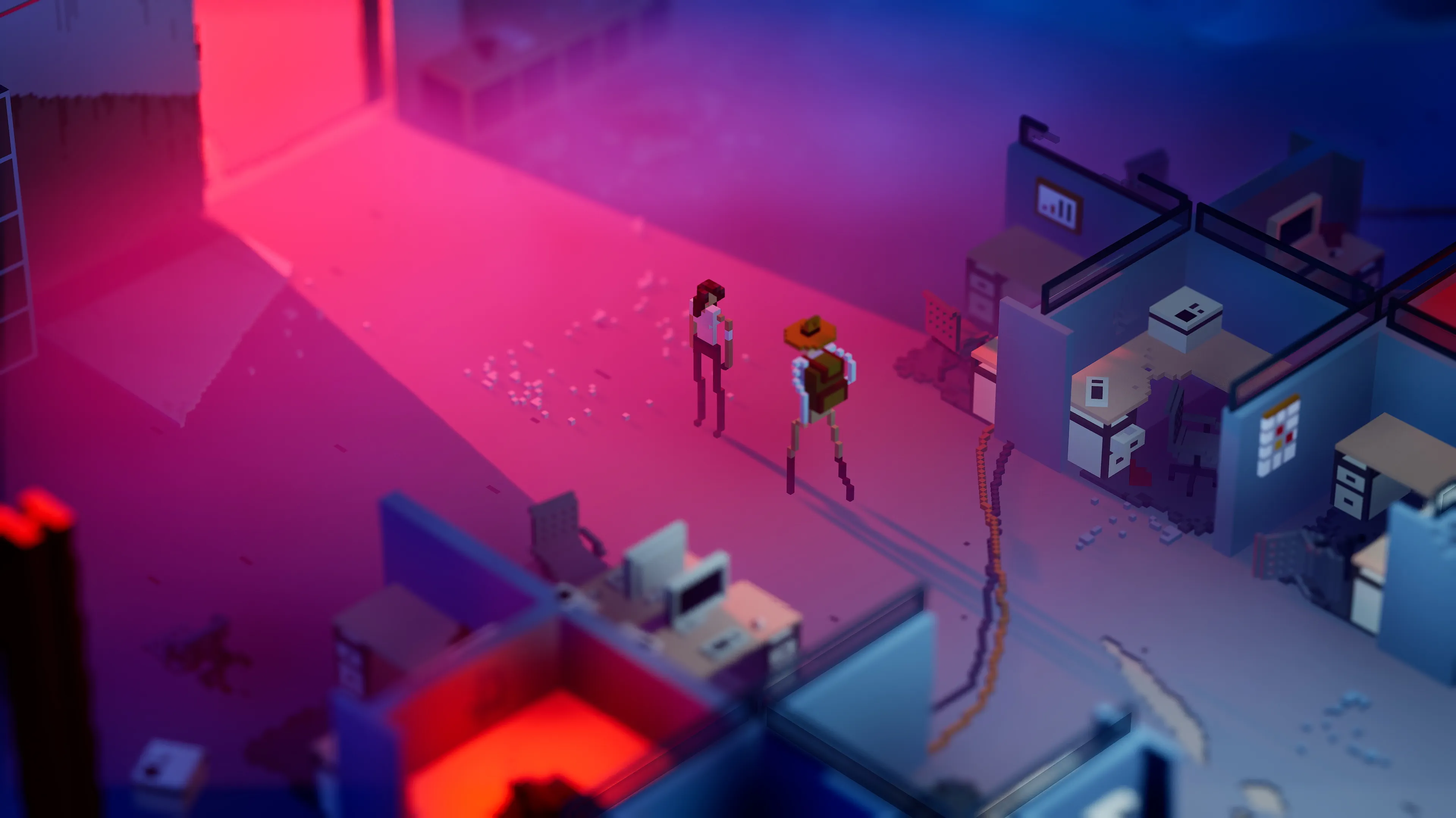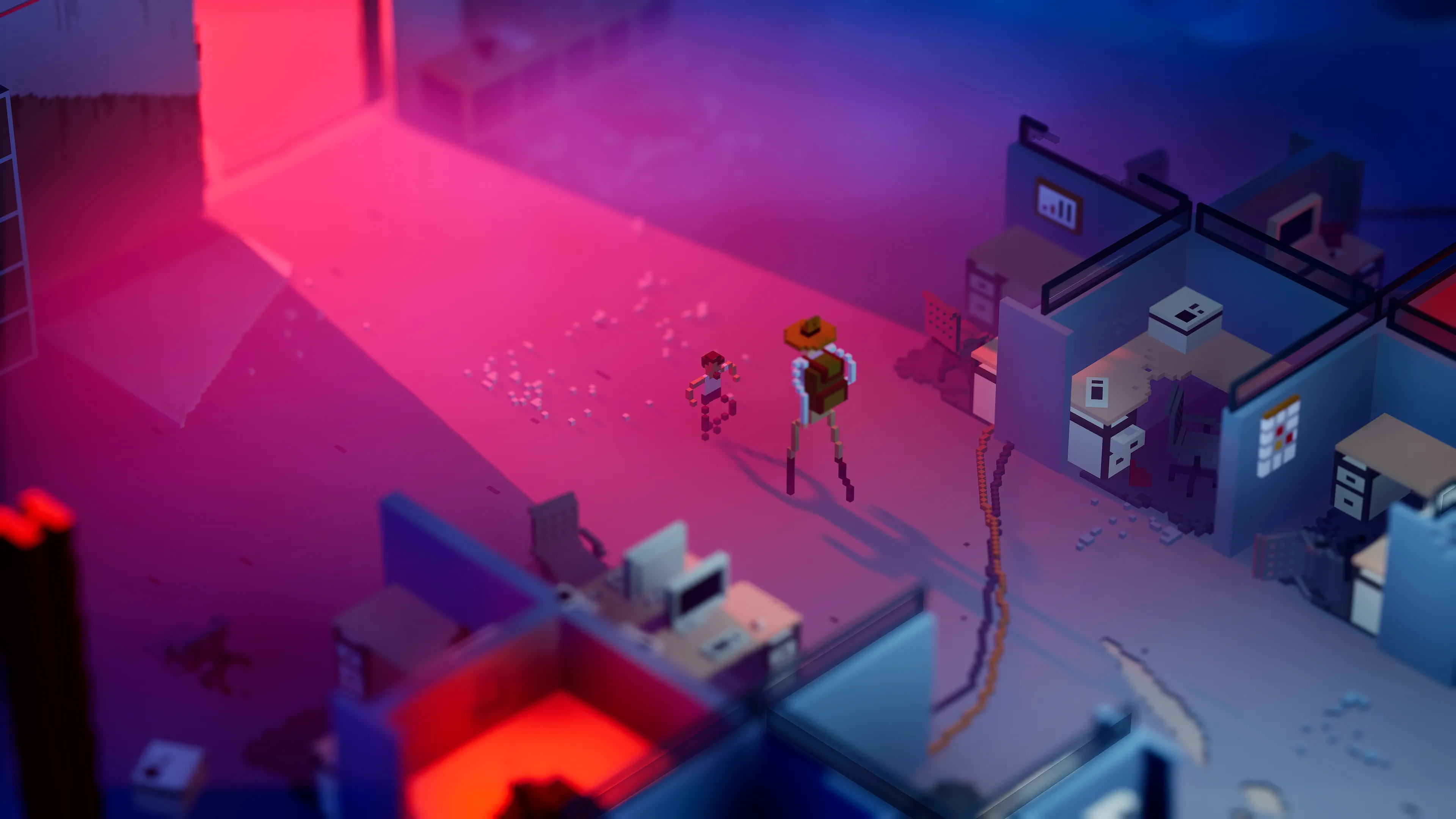 I was one of the first people to see the game in a private event prior to its reveal at the Xbox Partner Preview today. Its voxel-based art style really stands out, and every time you destroy an object or an enemy, they break down into tiny rendered blocks. The art and animation style adds a goofy element to the game's otherwise deadly serious tone, which ultimately strikes a balance I'm quite fond of. Your daughter will die if you don't move quickly enough. Also, there are chicken cultists who wear giant chicken costumes and worship The Great Old Rooster. At one point, the developers mention the team was inspired by Adventure Time, and yeah, I can definitely see that.