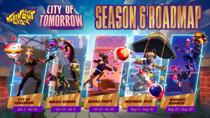 - Season 6 Roadmap - And there’s so, so much more coming in the City of Tomorrow! Just take a peek at this schematic for the next couple of months. We’re kicking off today with our City of Tomorrow launch event, followed closely by Heroes Reborn. We’ve also got Royale Party and this year’s completely-revamped totally-new Heatwave event to look forward to, capping things off with Midnight Madness!