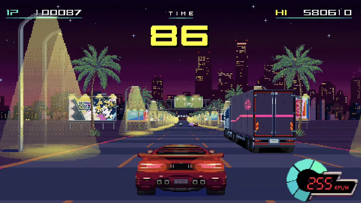 The story tying the various levels together is also disappointing. It’s presented as a coming-of-age tale that chronicles how a teenager called Kid discovers video games in a dingy arcade, and the freedom that comes from these digital worlds. However, the theme is mainly explored through cutscenes full of obvious teenage observations about isolation and belonging. Nothing actually happens, since the game doesn’t have plot points or character development. No narrative threads bind the different game genres either, so the levels you’re playing feel disconnected. Only in the Outrun-style game, which is bookended by musings about freedom, is there a smooth transition between the story and action.