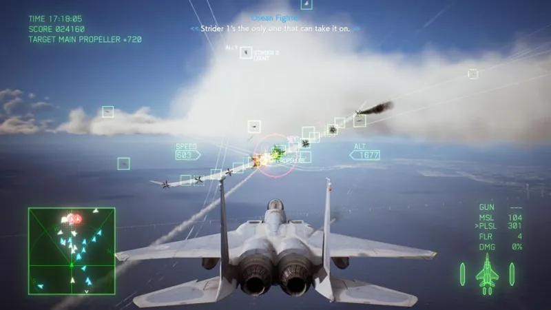 When you are engaged with rival ace pilots, different weather conditions often up the challenge; you may need to dart into the clouds of a raging storm to trail an adversary. This affects visibility conditions, and your plane gets batted around by strong winds – maybe even struck by lightning. When this happens, the electrical surge scrambles the HUD, making targeting and tracking enemies more difficult. It’s a little annoying to lose targeting, as it seems like it comes down to the random chance of a lightning blast, but it ups the chaos and makes you panic – it’s effective. Weather and low altitudes are also used to give missions a layer of complexity. For instance, you sometimes must fly at dangerously low altitudes to avoid radar detection – the series’ version of stealth, which functions well and delivers plenty of excitement in slower moments of specific missions.