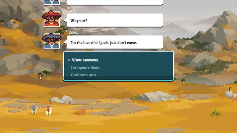 Arco is a pixelated RPG that follows a series of Indigenous travelers seeking revenge on a colonizing force that laid waste to their lives. Through each of the game's acts, you play as one of these adventurers and get a glimpse into a different tribe in Arco's countryside; Tizo is a grizzled old man, Itzae is a spirited brawler, and Afur and Chio are merchant siblings. Including so many perspectives of the same essential conflict injects plentiful nuance into the story, and I was always eager to see how new characters would affect the plot.
