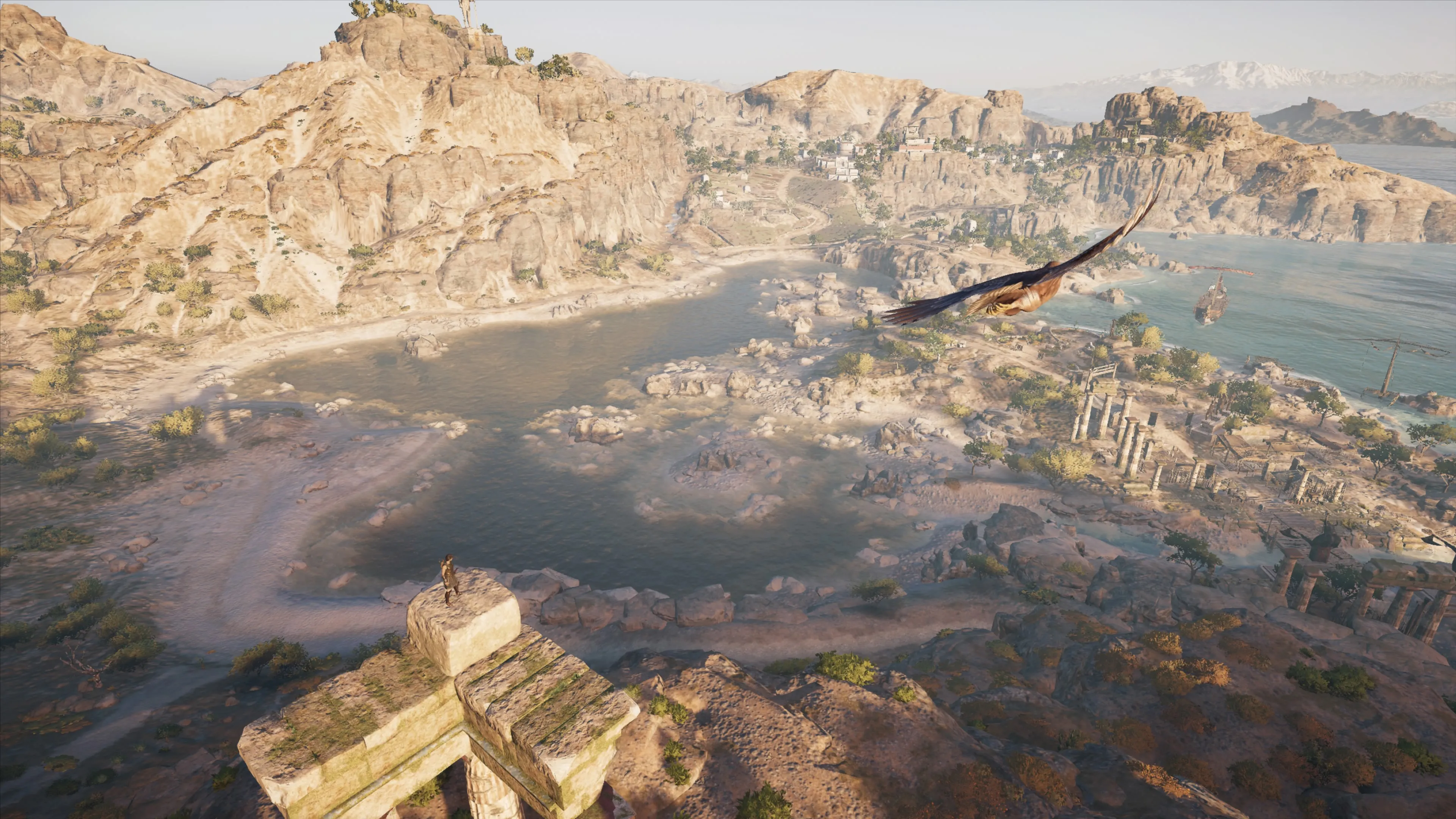 Naval gameplay returns in Odyssey in its most full-featured incarnation since Black Flag and Rogue. You can upgrade your ship, find sunken ruins, and hunt down pirates. It all works well and provides simple fun, but Odyssey doesn’t give you much incentive to go sailing. The naval encounters aren’t complex enough to be gratifying, and the rewards aren’t good enough to be enticing. Though I enjoyed the lovely views from my ship and the occasional exchange of fiery arrows, the naval component ends up feeling inconsequential beyond its function as transportation.