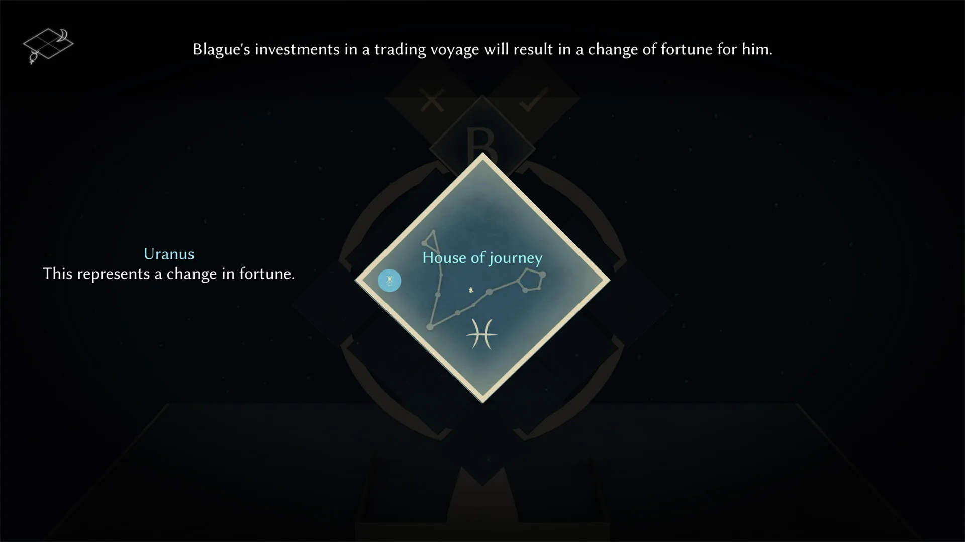 The star-gazing initially seems to have a deductive or puzzle-solving element; one of the first readings has you drawing parallels between the signs in the sky and the name of a vessel in order to recommend a ship to invest in. However, that falls by the wayside quickly, and you rarely need to decipher anything. The celestial elements influencing your choices (like “Uranus represents a change in fortune”) are technically present, but they feel extraneous since each option you’re presented with has a pretty clear interpretation summarized at the top of the screen. All you need to do is read them and decide which one to select, so the astrology becomes more of an aesthetic trapping than a mechanic you actively engage with.