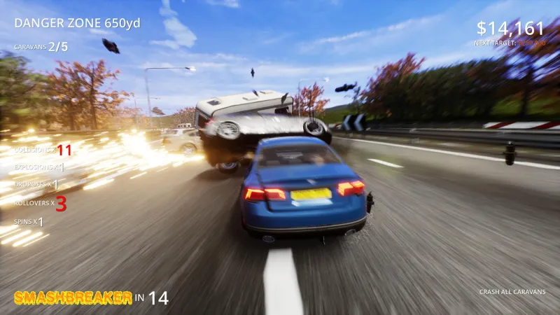 Three Fields Entertainment’s games so far (Danger Zone and Dangerous Golf) haven’t strayed from the studios’ roots as the creators of the Burnout series and its fabled Crash mode. Danger Zone 2 is no exception: You hurtle your car towards an intersection and hope to create as much chaos and damage as possible when you detonate your explosive Smashbreaker and blow up everything around you. But this sequel adds on to the formula by also emphasizing what you do before you get there, and in the process, expands the playing field – if only a little.