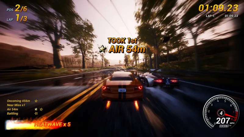 I chuckled at nailing traffic head-on at high speeds, and watching flaming cars flip and crumple. Dangerous Driving definitely has these moments, but it isn’t integrated with the racing in a way to make these crashes more than worth a few laughs. I was often annoyed – even when I sent another car tumbling – because the slow-motion crash interludes took me out of the racing zone. Sometimes you can’t even tell if it’s you or them being smashed. Taking someone out is also disorientating; the race continues in real-time, so you’re suddenly somewhere else on the track than when the hit was first initiated.