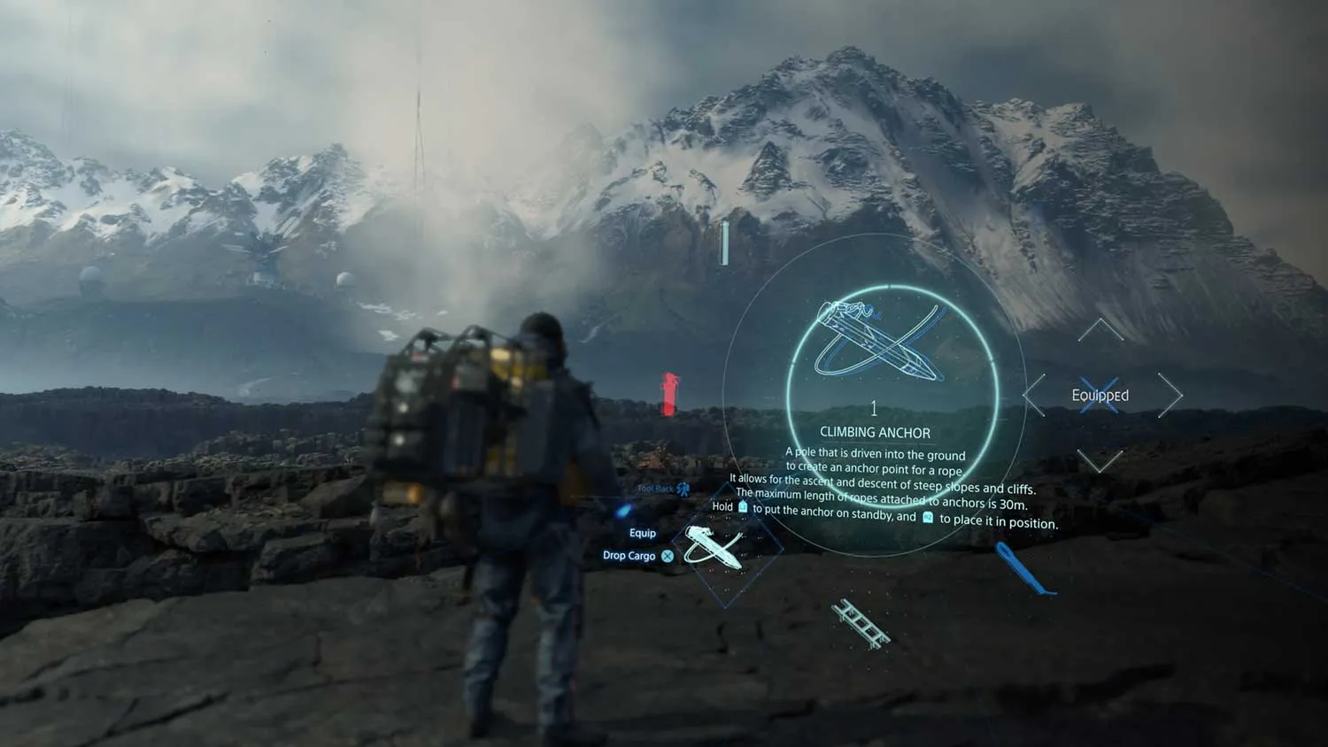 Overall, Death Stranding’s intertwining systems are well thought out. Rain and snow (called Timefall) damage everything they touch, so I like the sense of urgent survival when the weather report shows precipitation on the way. Building zip-lines and safe houses in useful areas is satisfying, especially since they augment the overall network of nodes that keep you supplied and aid your travels.
