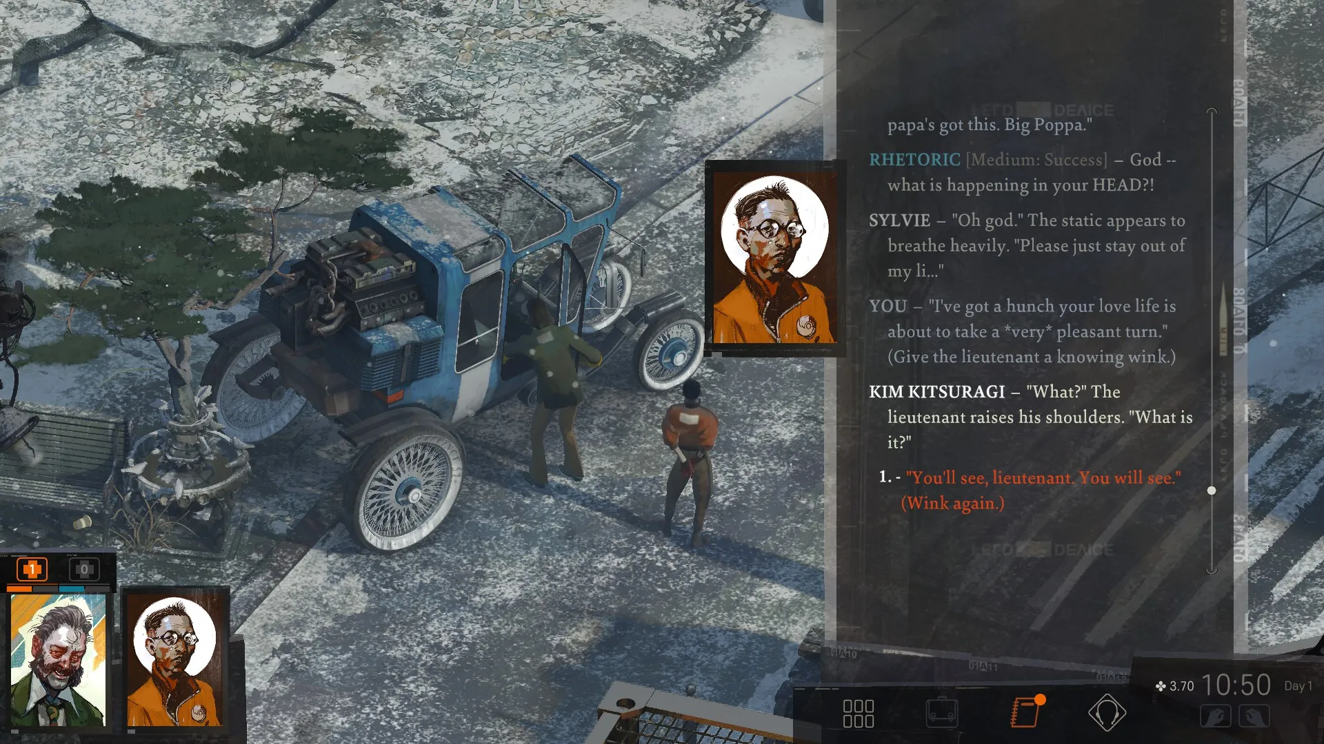 While most of the core content remains unchanged in The Final Cut, new political vision quests let players choose one of four new tasks tied to different ideologies. These mutually exclusive quests open up based on your detective’s political leanings – like communism and fascism – and you ultimately choose which one you’re going to pursue. After saving/reloading to see what they all offer, I am impressed at how well these new objectives fold into the original experience. They don’t feel tacked-on or extraneous; they are natural extensions of the themes that were already there, acting as satisfying punctuation marks. Some of them introduce new characters and areas, while others let you interact with familiar faces in different contexts. The fascist (a.k.a. racist) thread made me laugh the most, but whichever one you choose, the vision quests are cleverly written and have minor-but-lasting effects on the game once you complete them – like visual changes to the big statue in the roundabout, for example.