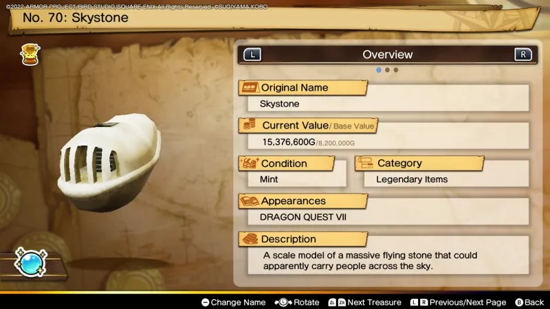 Once you return to your hideout and appraise your haul, it reveals a beautiful rendering of a character or item from past Dragon Quest titles. Even though I didn’t recognize many of the items I found, I appreciated this detail a lot, and I’m certain that nostalgia for the series would greatly heighten the experience. And as much as I didn’t really care for the treasure vision mechanic, I can’t deny the satisfaction I felt when I returned to base with a full inventory and uncovered an iconic, expensive relic that I got to add to my hoard.