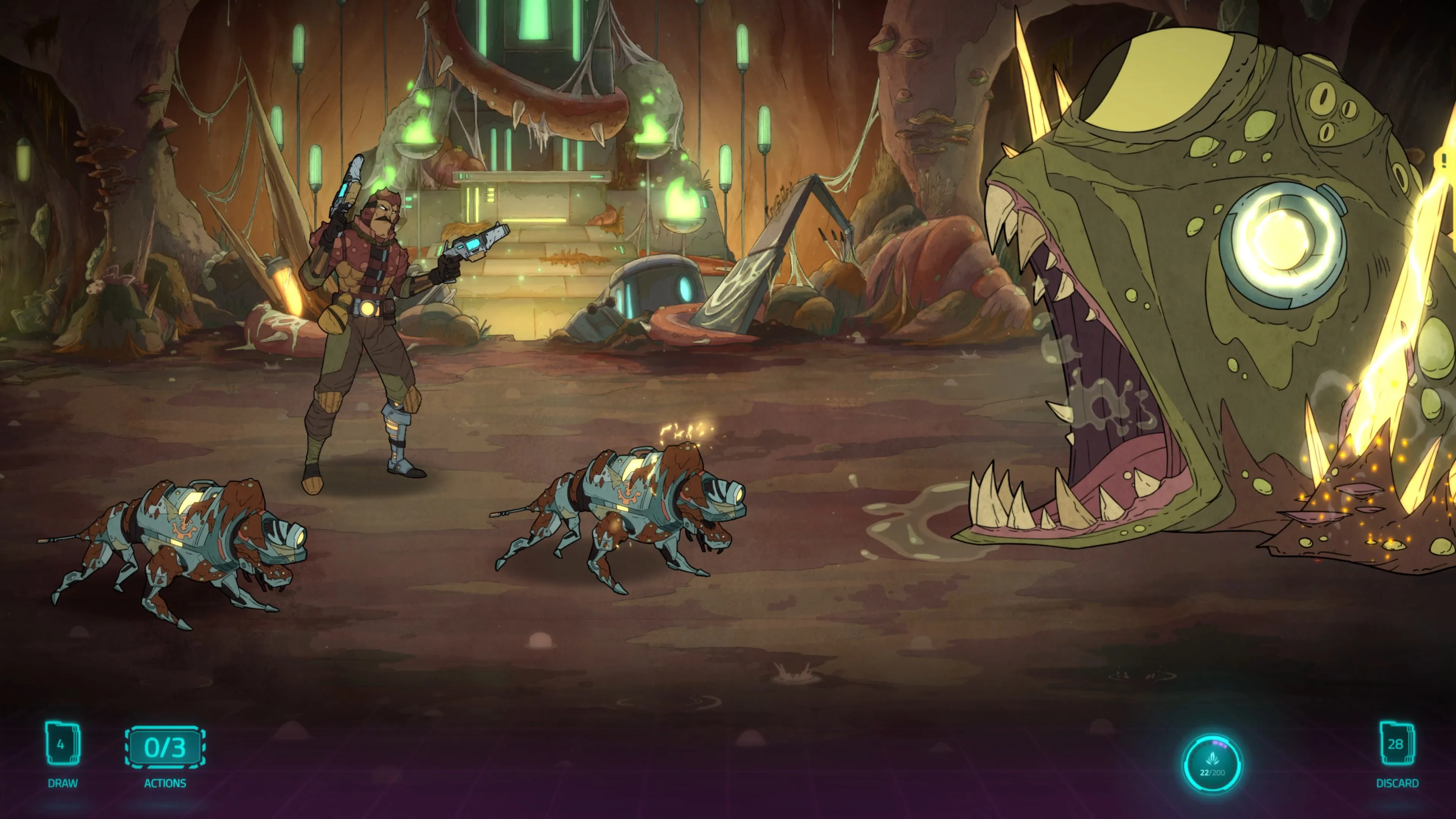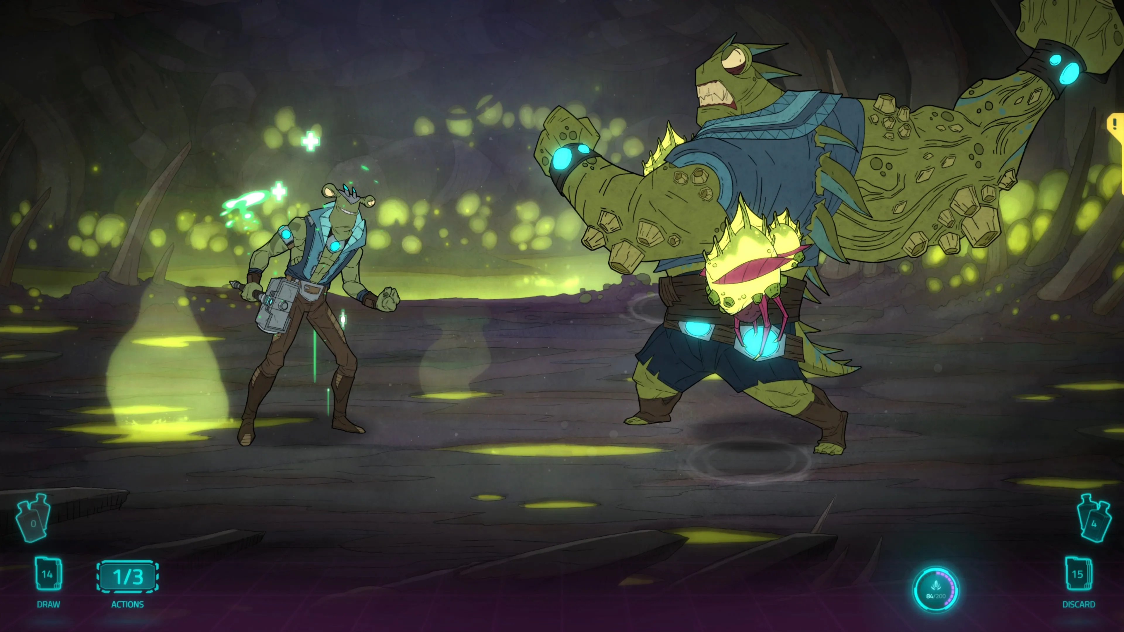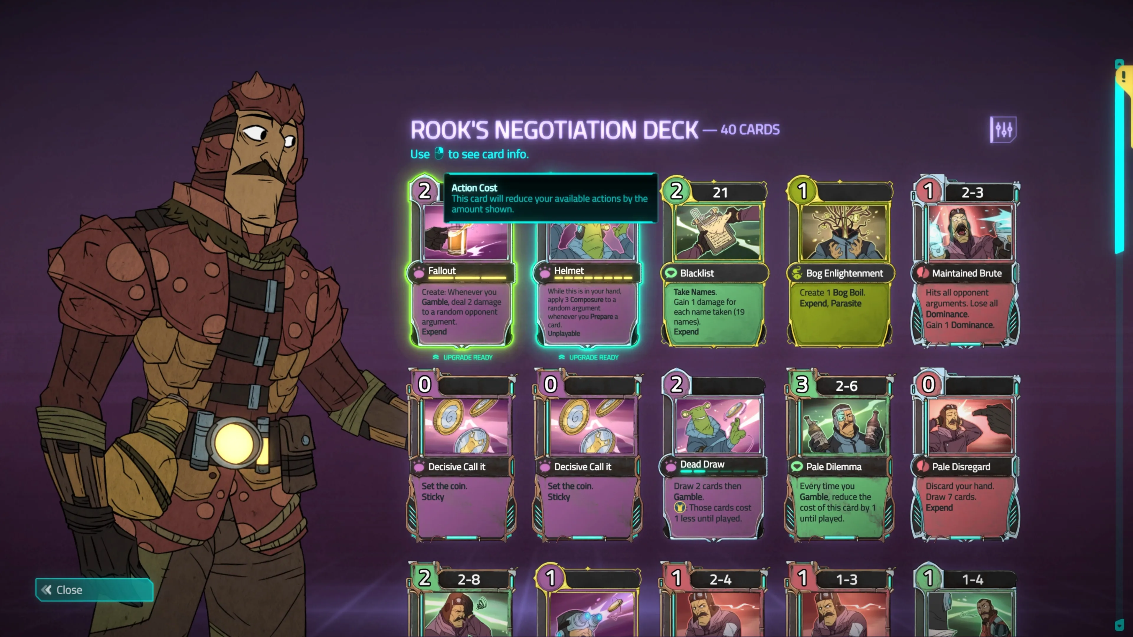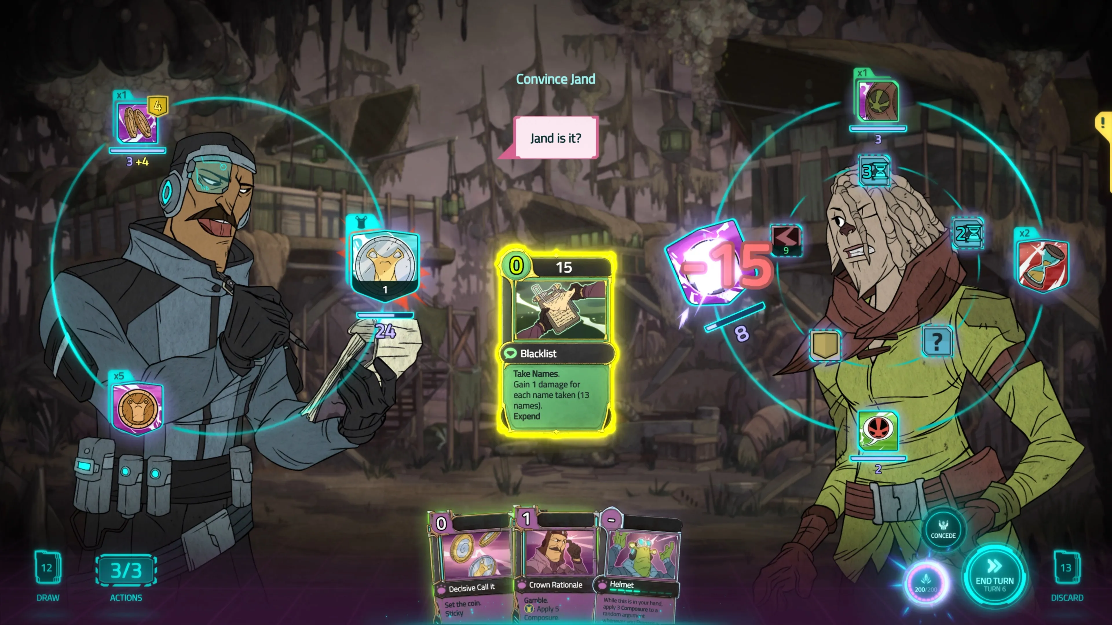 The bulk of Griftlands’ action revolves around card slinging during heated negotiations and battles. However, the combat and negotiation systems both have bespoke decks and mechanics. Battles are straight forward physical fights where you use attack, defense, and augmentation cards to defeat the opposing force. These augmentation cards do everything from apply damage over time to increase the power of other attacks and they do a great job adding strategic depth to the action. Sentient enemies and allies have panic points and surrender once their health drops below a certain threshold. This clever system gives you a powerful and intriguing choice to spare or execute your foes, though accidents happen, and people can die regardless of your intentions. Killing an enemy rewards you with cards to add to your deck, but their death makes the public aware of your pension for violence and can turn a victim’s friend into an enemy. I enjoyed maintaining the delicate balance of keeping foes alive while dispatching of their cohorts to keep my character’s standing in the world as pristine as possible. Adding this combat puzzle to encounters wonderfully extends agency into a system easily boiled down to kill or be killed and helped add additional stakes to each encounter.
