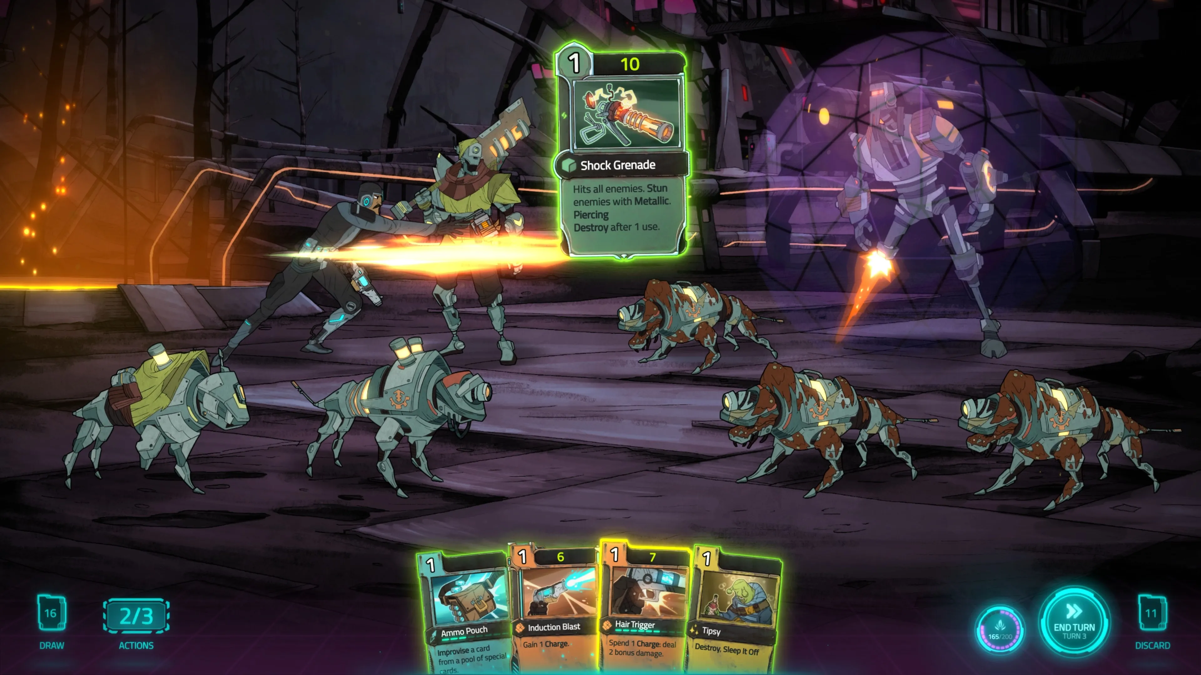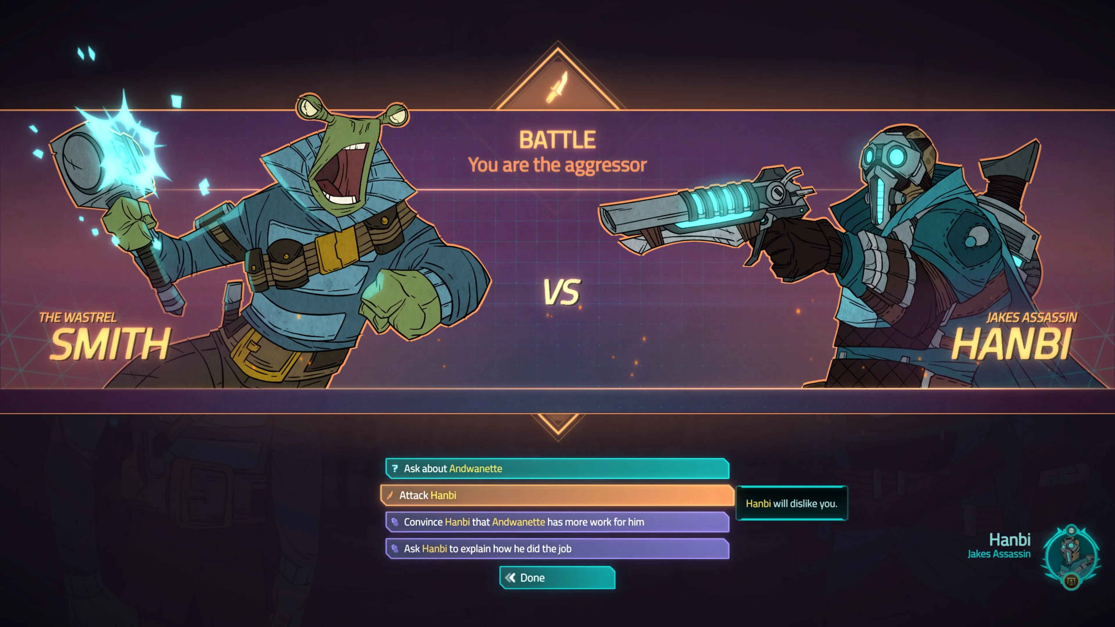Negotiations, on the other hand, are my favorite part of the game. I love seeing my conversations represented through game mechanics rather than the typical dialog tree. Additionally, I appreciate being able to navigate conflicts without always resorting to violent tactics. These debates are triggered when trying to get information, pushing for a few more shills on a completed job, or to demoralize an opponent before a real fight. Your goal is to reduce the resolve of your opponent’s core argument. Side arguments have various effects on the discussion, giving benefits to yourself or hindering the opponent. These additional arguments stand separate from your core argument and must be defended as if they were allies in battle. Failing a negotiation doesn’t end the game, so negotiations present a complex, fun, and low-risk solution to some problems. Losing a negotiation may lead to a physical confrontation, but talking things through can avoid some confrontations or provide buffs during street fights, so it’s usually worth a shot. I found it a little overwhelming at first to learn a second set of card mechanics, but ultimately I found the flavor and execution of the negotiation system to be excellent.