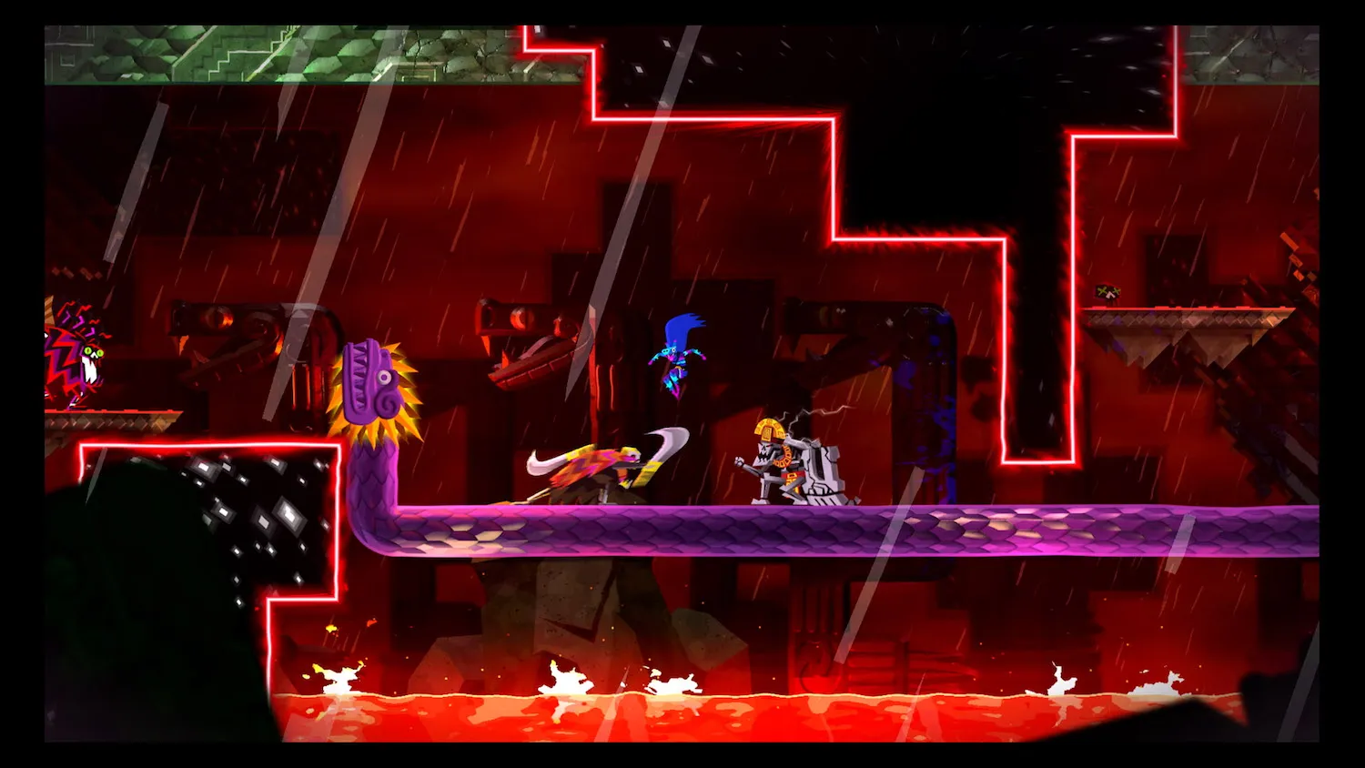 Both the combat and platforming boast incredibly precise controls. Building up big combos against enemies is fun and gets easier as you level up your special attacks, which happen to double as navigation tools. The uppercut functions as a double jump, and plays into a clever mechanic where breaking through the shields of certain enemies requires specific attacks. A glowing blue enemy requires Juan’s sideways thrust ability which also breaks blue doors, and gives the extra distance often needed to hit a just out-of-reach ledge. This shield-breaking system means you are constantly using Juan’s entire arsenal of moves, preventing you from relying on a favorite attack and approaching fights a little bit like a puzzle. It made every battle consistently exciting.