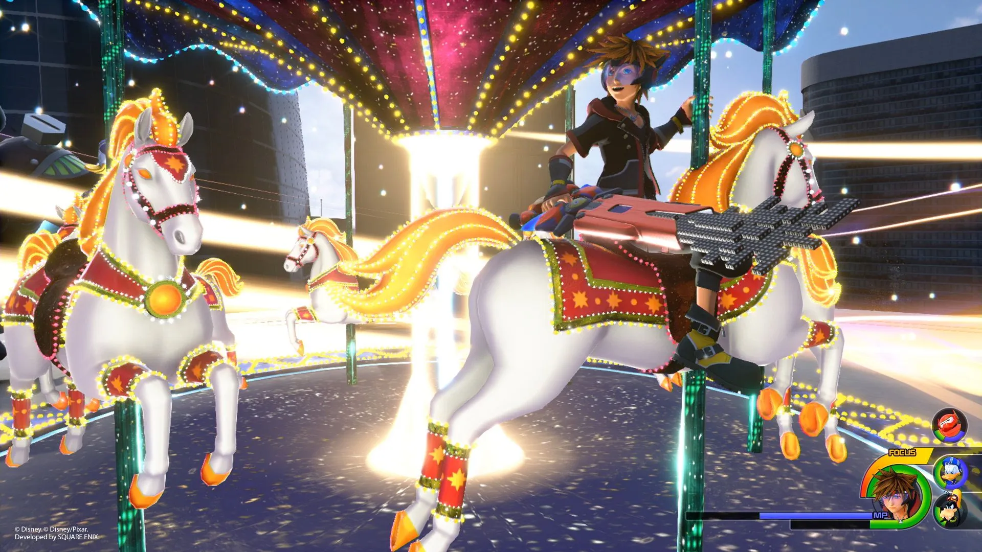 In terms of gameplay, everything that worked in previous entries is on display here. The action-packed combat is fast and fluid, testing your twitch skills and ability to recognize attack patterns. The battlefields are chaotic, which can be overwhelming, but the arsenal of options you have to eliminate foes is staggering. Chaining combos becomes extremely rewarding with keyblade transformations, which let your weapon turn into various implements, including everything from dual pistols to yo-yos. Do enough damage and attack an enemy when a green indicator flashes, and you can use iconic Disney attractions, like the mad tea cups and pirate ship, to take down enemies in a jiffy. This doesn’t even tap into the special attacks you can do with your party members, such as flinging Goofy at enemies or riding a rocket with Buzz and Woody to ram your enemies. Incidentally, after being away from Donald and Goofy for the last few entries, having them at your side again feels great.