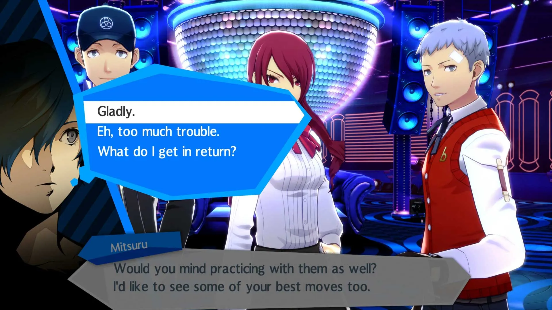 Replaying songs unlocks new social-link conversations with the SEES team, which comprise most of the narrative in lieu of a proper story mode. As you finish more songs and wear different outfits, you get to have lighthearted chats about dancing, life goals, and more. Elizabeth frequently butts her way in throughout, and her naiveté about the real world (and its turns of phrases) make her the standout character. The plot is fairly bland and pointless, but the little moments along the way make up for it.