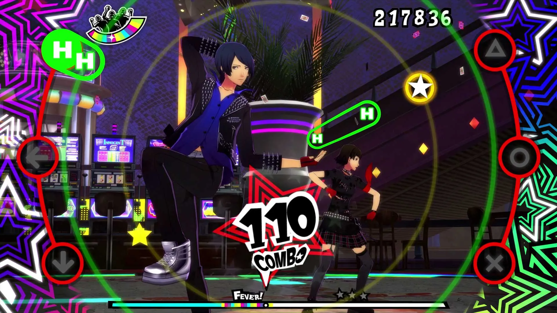 The dancing itself is straightforward as you tap or hold buttons in time with the music, though the interface can be too stylish for its own good. It prizes the J-Pop dance routines the Persona 5 cast performs in the background as much as the music itself, which means notes originate near the center and move towards the edges of the screen. The layout works well enough on lower difficulties, but as tougher songs introduce more intricate note patterns, it can be hard to discern what note to play when as they drift apart. Notes that require you to tap multiple buttons at the same time are connected by a giant pink bar and clutter up the screen, and I even failed to notice a note completely in the chaos a few times. I got used to the interface and was able to have fun with it after a few hours, but it’s a case of form over function that emphasizes something I wasn’t paying much attention to most of the time.