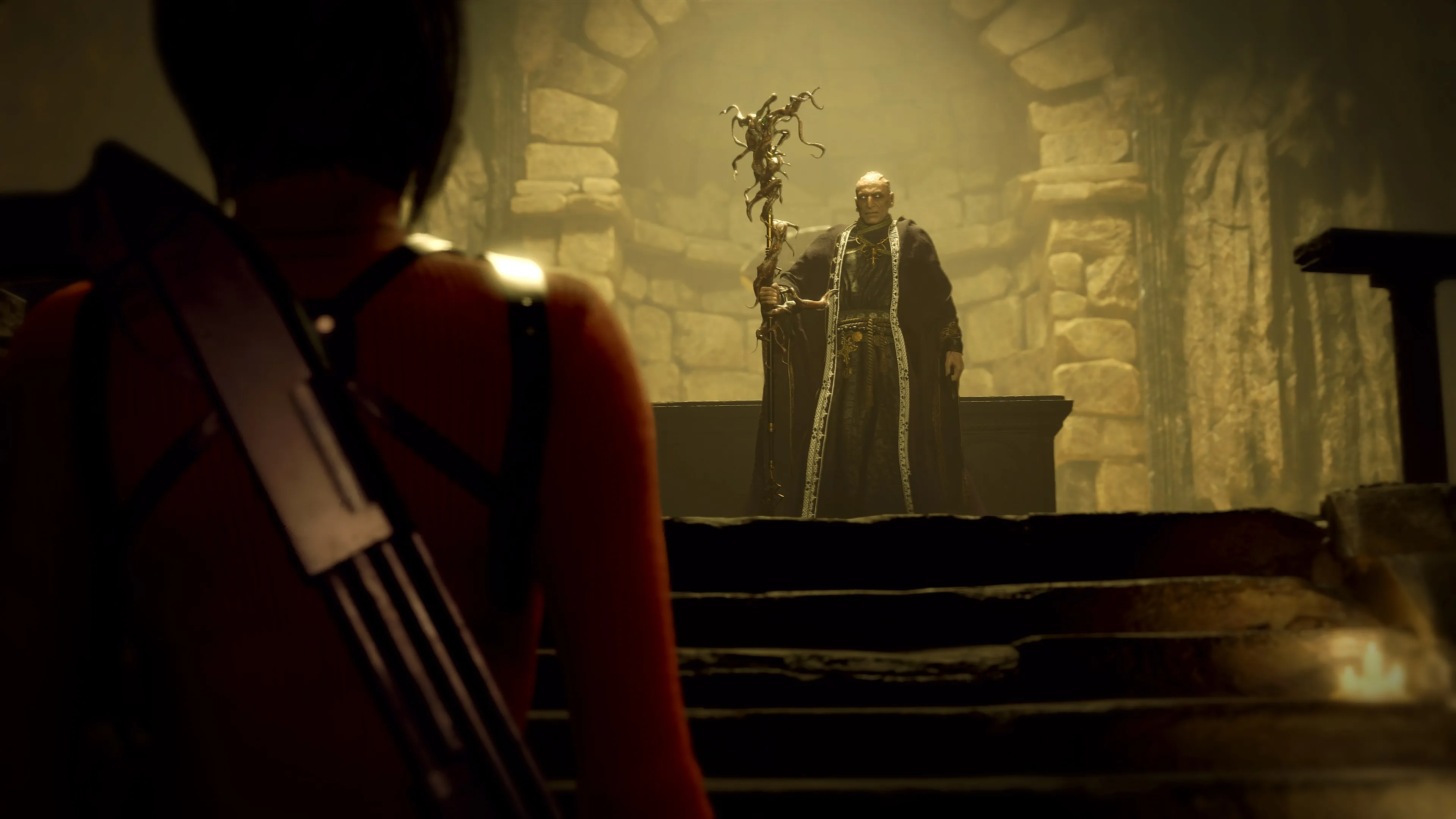 For the most part, Separate Ways plays identically to the base game. Ada uses similar weapons to Leon, carries a comparable attaché case, and is, presumably, the merchant’s only other customer. She does, however, carry a grappling hook. Alongside looking cool in cutscenes, it also lets Ada reach certain vantage points and positions Leon can’t. It doubles as both a new, fun way to move around and explains why she’s able to move through the adventure in only about six hours when, theoretically, she has the same starting and finishing line as Leon.