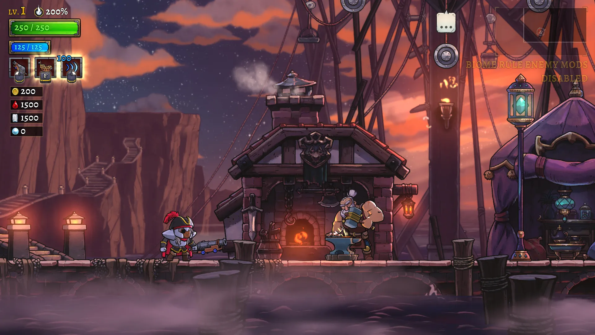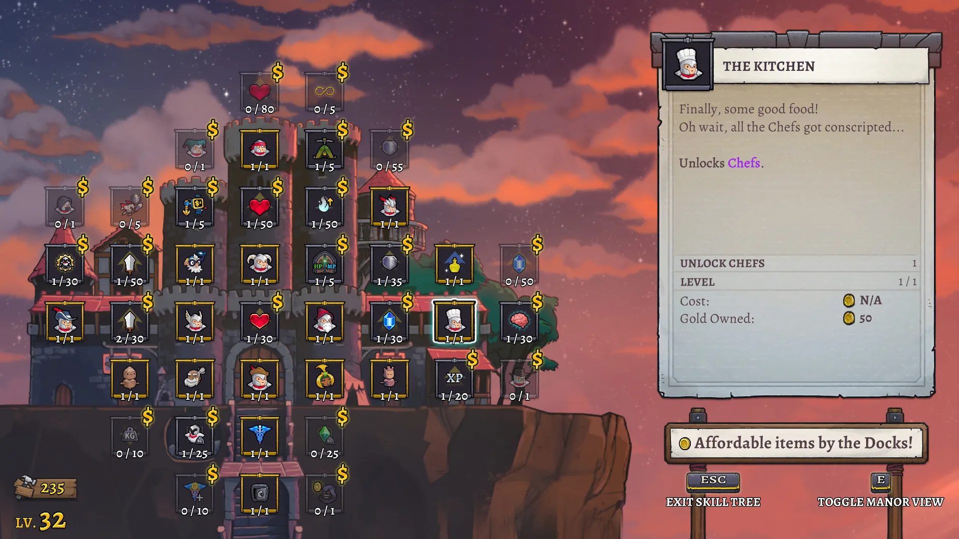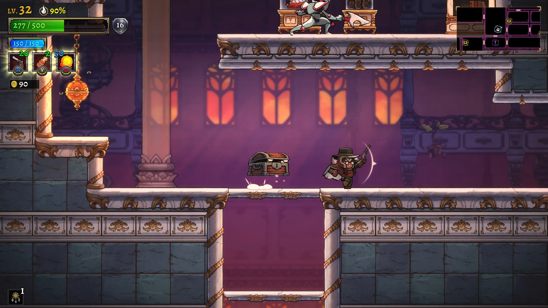 However, class identities are more straightforward and have been greatly expanded upon from Rogue Legacy. This time around, each heir’s class determines which weapon type they use and an additional ability they have at their disposal. Knights comes equipped with a big sword and can block attacks with a shield, while Mages sling fireballs from their wand at a distance and can use two spells instead of one. Rangers can aim and fire a bow and create leafy canopy platforms to fire from in the air. The Pirate can fly around in an airship shooting cannonballs at the foes in its sight. I adore each class identity, even if I found about half of the choices hardly viable for my playstyle. I gravitate towards a specific few like the katana-wielding Ronin and the Boxer, who builds up quick-fisted combos and finishes off-targets with a devastating haymaker. Classes like the Bard, which creates music notes that you detonate with a spin kick, or the Gunslinger, which fires a volley of shots from their pistols, need a bit too much finesse for my liking.