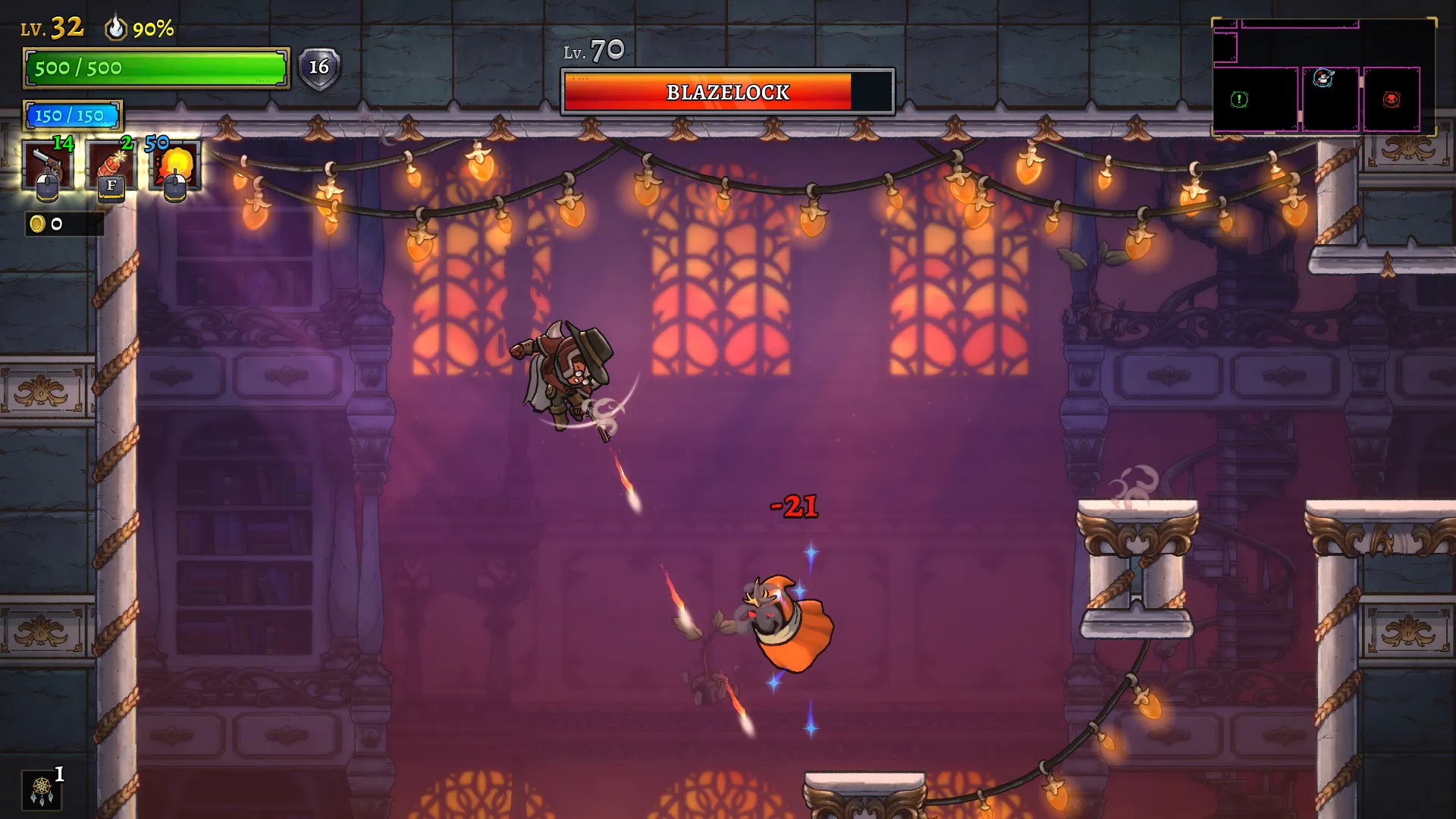 Items like the marble statue, which causes a small projectile-nullifying shockwave whenever your feet touch the ground, are a blast to find and strategize around. I’m also a fan of the poison and fire effects that deal damage over time to add a little extra zing to every attack. However, collecting Relics has a drawback, and it’ll cost you your HP. Relics feed off a stat called resolve that’s tied to a given heir’s vitality. If you have enough Relics in your possession, your max health drops in relation to the resolve cost of the magical item. It’s a risk/reward system that I understand would be too powerful if Relics were unchecked in some way, but I did lament that the game doesn’t let you go wild with every enhancement you find as other rogue-lites do.