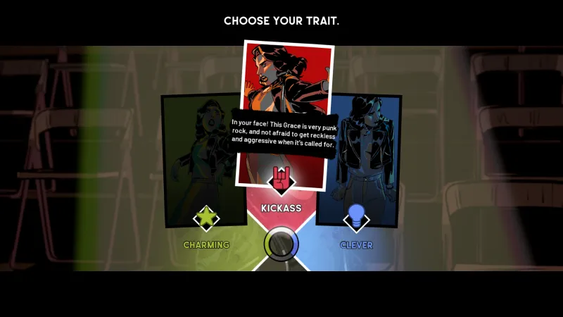 The game's title refers to it as a "role-playing" musical, but that term might be misleading to some. There is no gear, experience, or leveling up – just role-playing in the truest sense of the word by making decisions as your version of Grace. At the start of the game, you get to choose one of three personality traits (Charming, Kickass, or Clever) that unlock different dialogue options during conversations. Most of the gameplay consists of communicating with people and choosing what to say, either through speaking, or when Grace decides to activate her powers through singing.