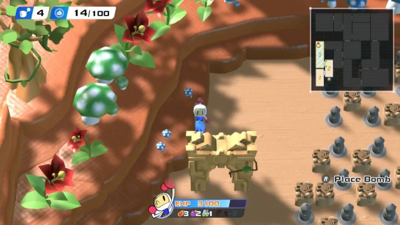 The gameplay of story mode attempts to fuse classic Bomberman gameplay with a pseudo-open-world design. As you explore three different planets, you find cute little creatures called Ellons that have the ability to power technology. Up to five can follow you, and you use them to unlock fast travel points, but they can also be killed by your bombs, so you must keep them close to avoid getting hurt. Meanwhile, your total Ellon count is used to open gates to new areas or enemy bases. The hunt for Ellons gets stale quickly for a simple reason; Bomberman's toolset is not designed for exploration.